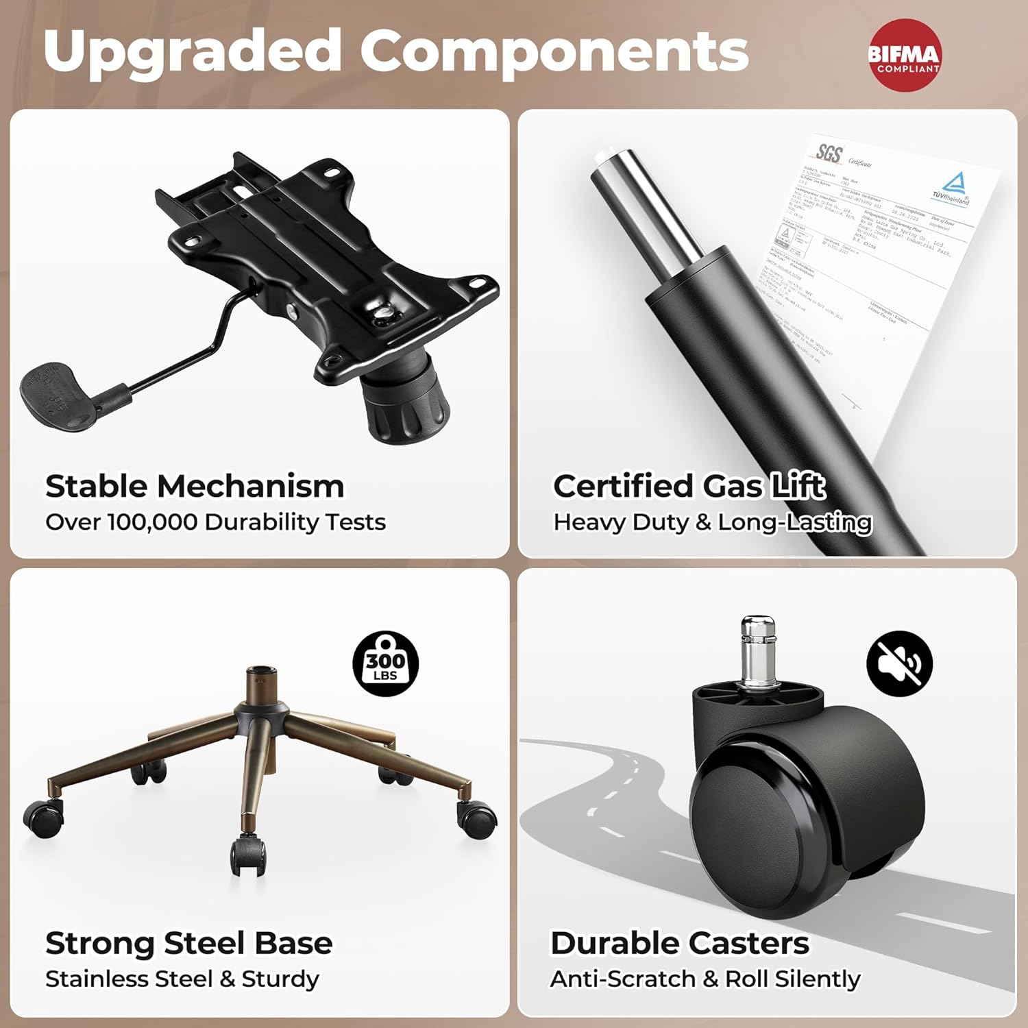 - Sturdy Construction: This padded task armchair features strong metal frame, curved backrest brackets that follow the curve of the human spine for stress relief, tested adjustment mechanisms and gaslift for stability even for tall and strong people, and high-quality 360° swivel rolling rotating casters avoid scratching the floor, can support up to 300 lbs. Whether you're working or relaxing, this modern chair offers a comfortable experience