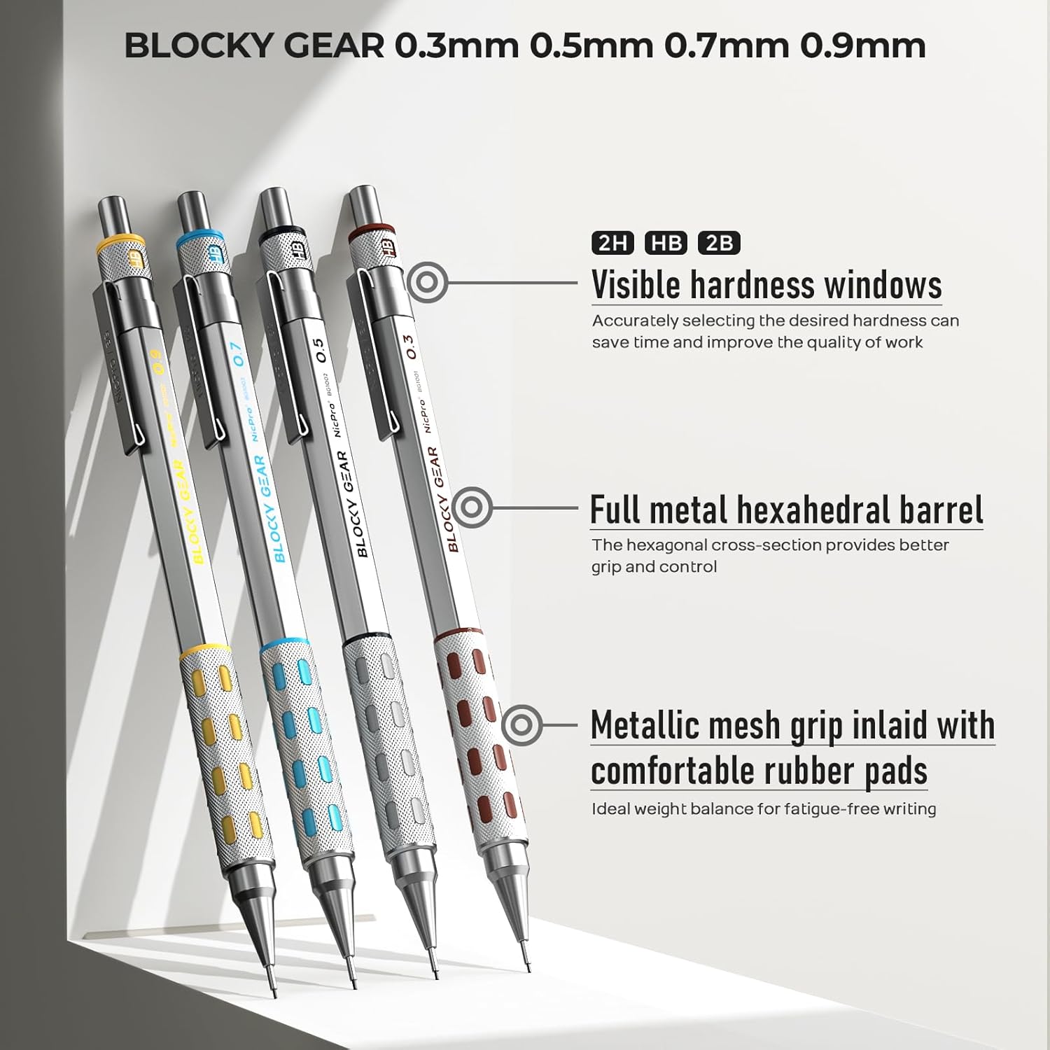 Nicpro 4 Pack Blocky Gear 0.3, 0.5, 0.7, 0.9 mm Metal Mechanical Pencils Set with Case, Lead Drafting Pencil with 8 Tube Lead Refills(HB 2B), Erasers, Eraser Refills for Art Writing Sketching Drawing