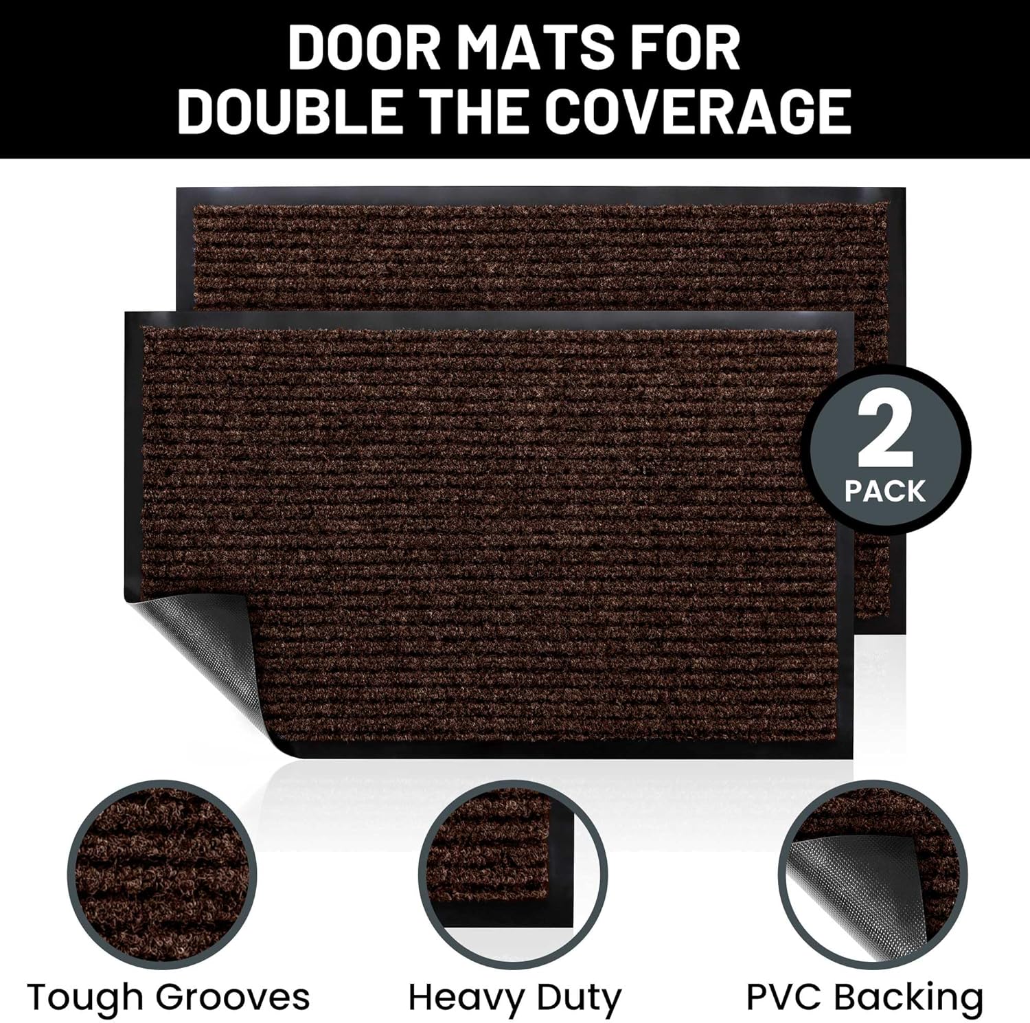 - Includes 2 DARK BROWN X-Large Indoor Outdoor Floor Mats: Enjoy two amazing heavy duty high quality ribbed polyester door mats (Larger 48" x 36") that will be perfect welcome for the everyday home. Amazing value 2-Pack.