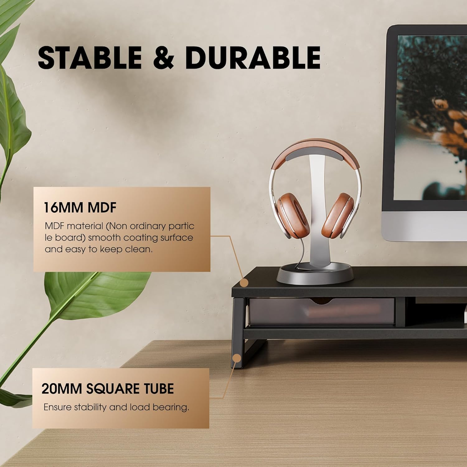 - 【Heavy-Duty Stability】Built with 16mm/0.6” scratch-resistant panels and 20mm/0.8” square tubes (crossbeam reinforced support), this monitor riser with drawer holds up to 45kg/99 lbs. Durable, wobble-free, and easy to clean.