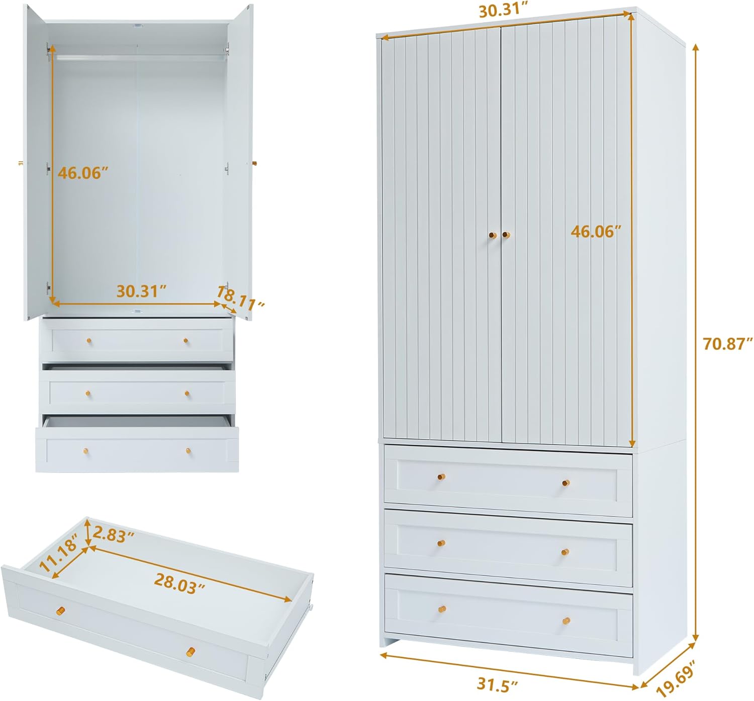 Wardrobe Armoire Wooden Closet with 2 Doors,71" Closet Armoire Set of 2,3 Drawers Household Freestanding Wooden Storage Cabinet for Bedroom (White)