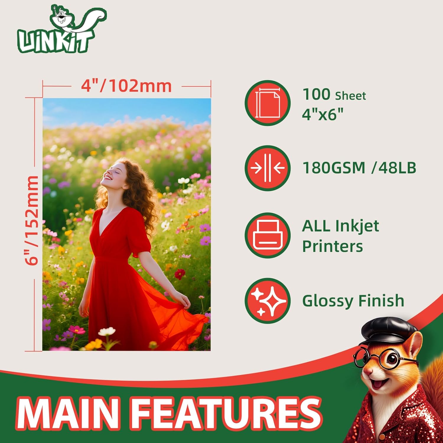 Uinkit Premium Glossy Inkjet Photo Paper - 4x6 Inch, 48lb 180gsm, 100 Sheets - Professional Photographic Quality, Dye Ink Compatible, High-Gloss Finish for Vivid Memories & Instant Prints