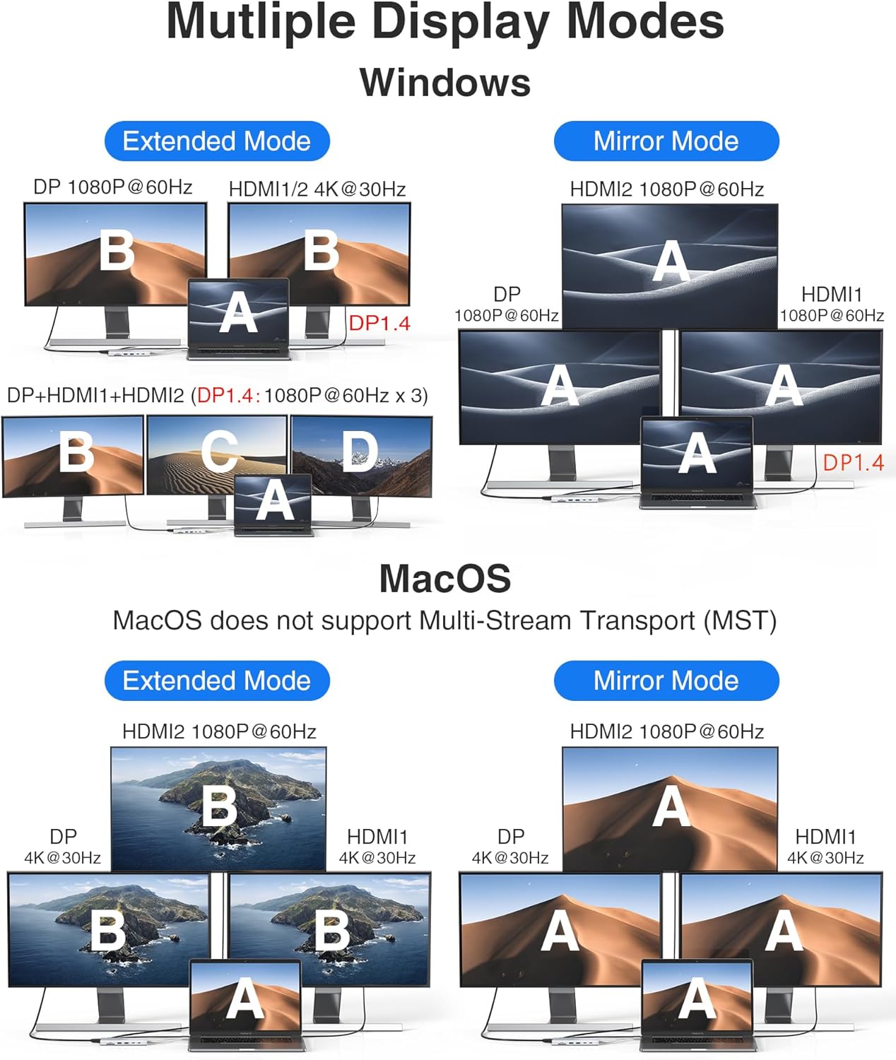 - Triple Display Docking Station: The hp docking station for laptop can easily to achieve dual monitor and 3 monitors displays for Windows, using different screen to do different projects will make your work/life more efficient. HDMI 1 max up to 4K@60Hz, DP/HDMI 2 up to 4K@30Hz(work separately while source is DP1.4). When connect 2 displays, resolution max up 4K@30Hz+1080P@60Hz(DP1.4 source). Display output will be 1080P when triple displays. Note!!! Mac OS ONLY support SST Mode(AAA,ABB)