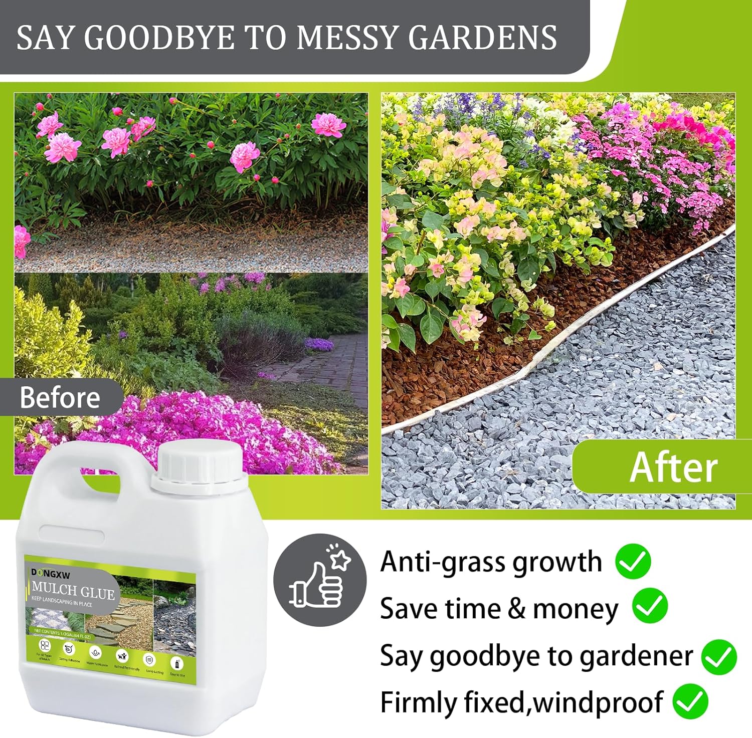 - Strong Adhesion Mulch Glue for Landscaping: Dongxw’s powerful mulch glue securely holds rocks, gravel, rubber mulch, and wood chips in place, minimizing erosion and preventing displacement from wind and rain while allowing water and essential nutrients to penetrate the soil, curbing weed growth and promoting a healthy landscape.