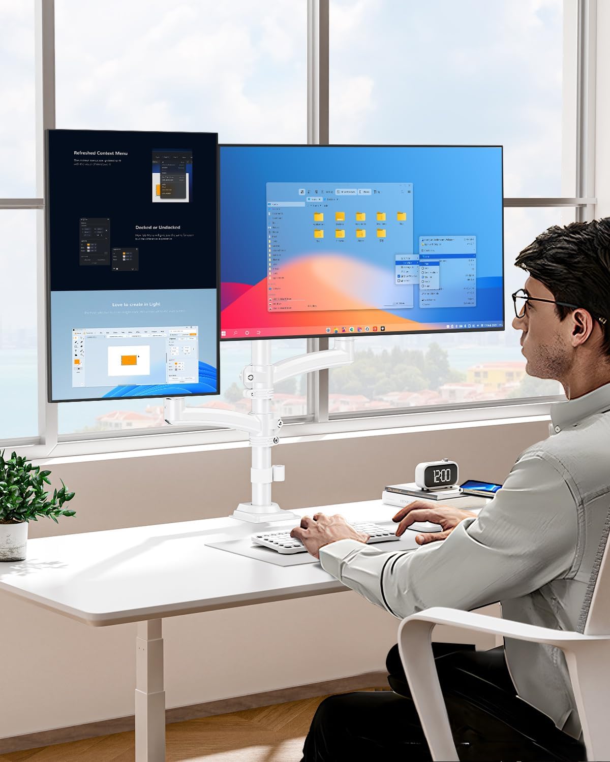 - Space Optimization - Mounting your monitors on this double monitor mount frees up over 80% of desk space, leaving ample room for keyboards, mice, and laptop setups. Built-in cable management keeps wires neatly hidden, transforming cluttered work areas into clean, organized stations.