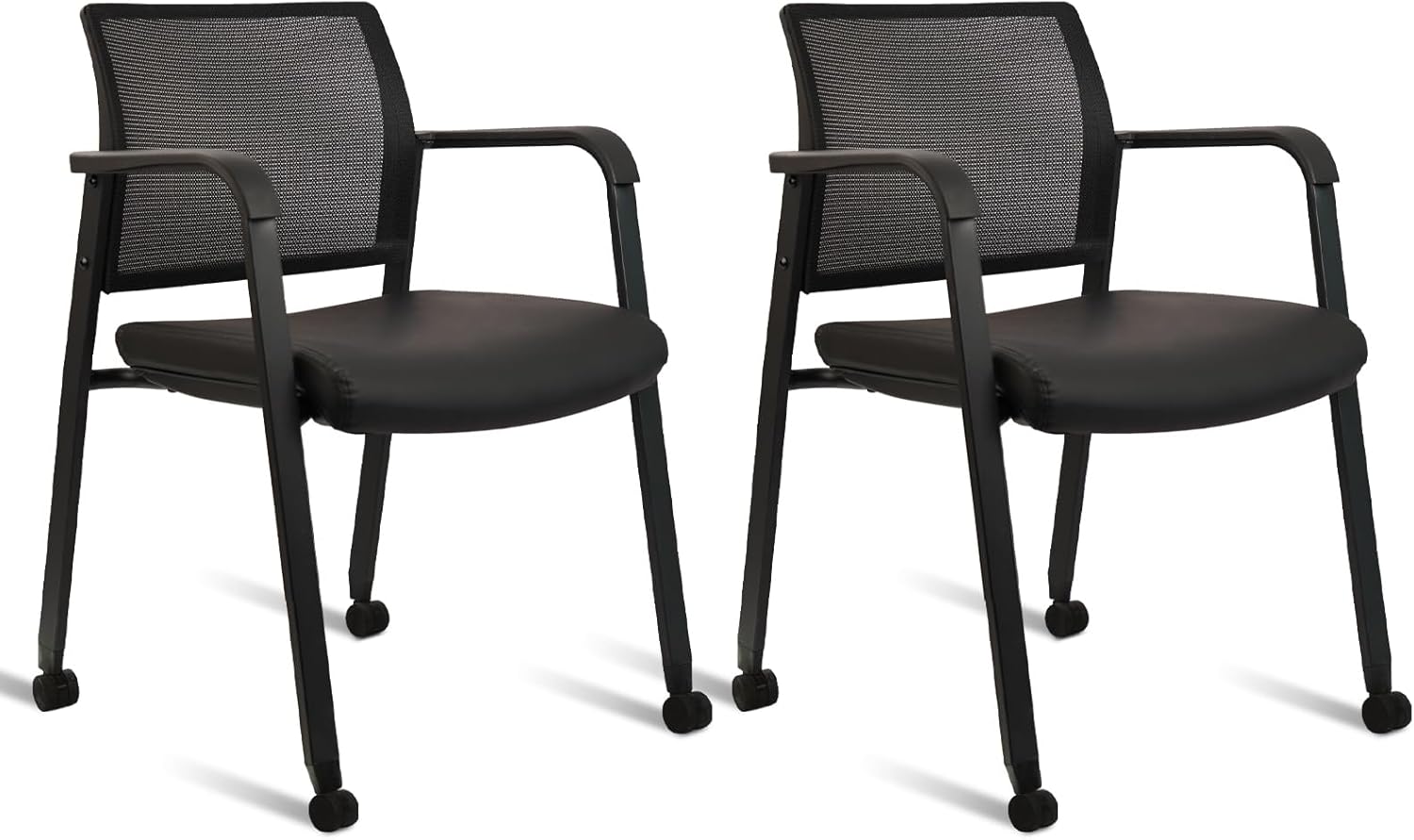 CLATINA Stacking Office Chair with Wheels, Mesh Back Waiting Room Guest Chairs with Arms Comfortable Leather Cushion Stackable Desk Chair for Conference Reception School Side Stationary, Black, 2PK