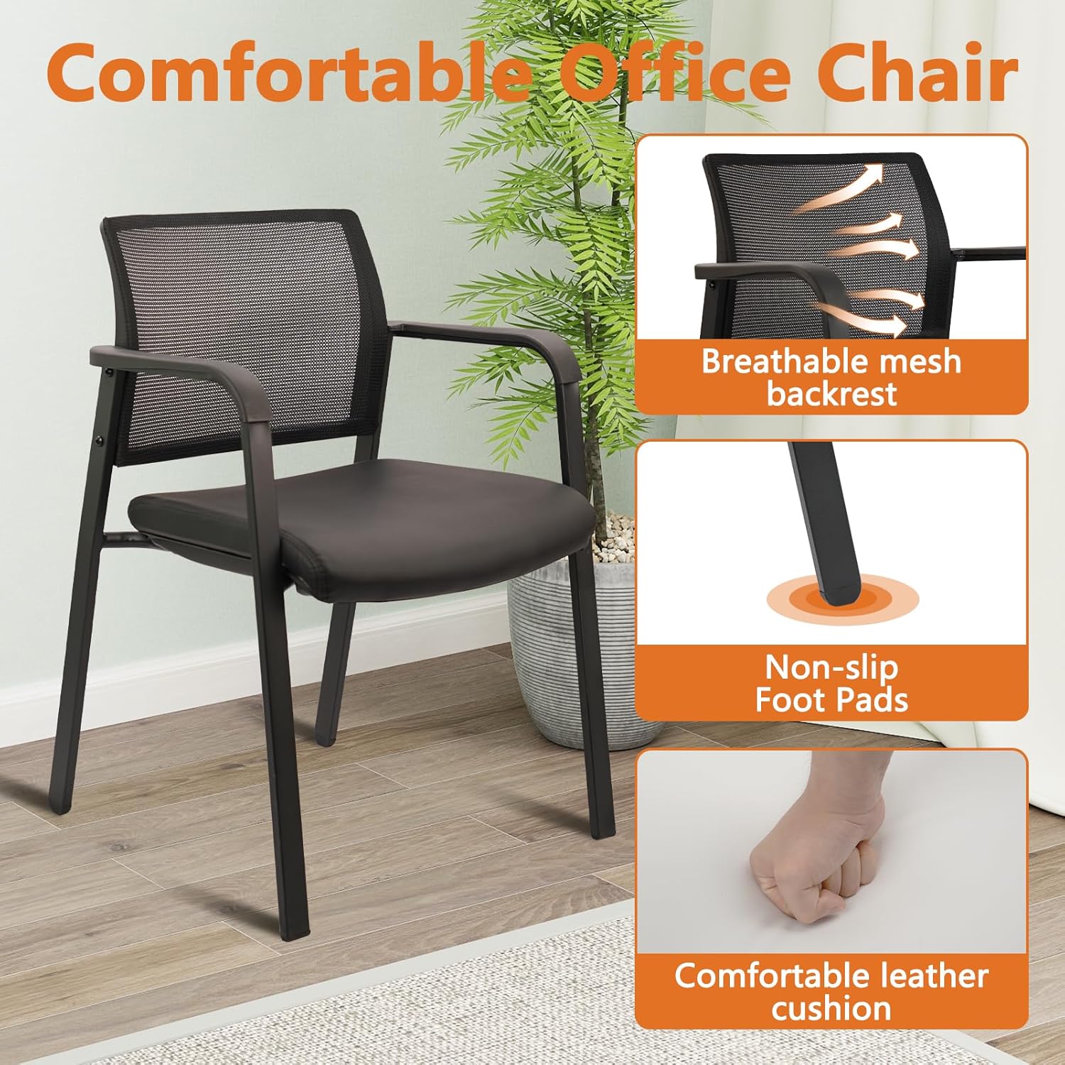 CLATINA Stackable Office Chair, Mesh Back Guest Chairs with Comfortable Leather Seat Arms Stacking Ergonomic Desk Chair No Wheels for Conference Waiting Reception School Stationary, Black, Set of 2