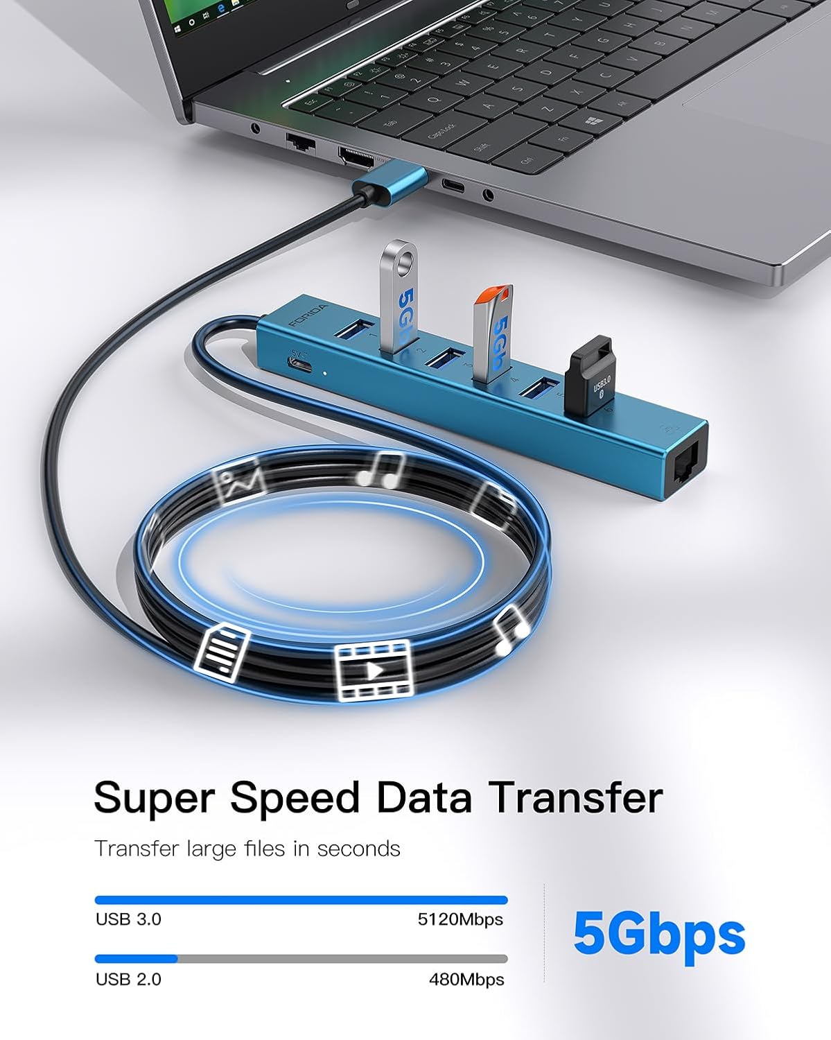 7 Ports USB 3.0 Hub, USB to Network HUB with 3.9ft Long Cable for Laptop, USB Splitter with Gigabit Ethernet Port and 5V/3A Power Port, MultiPort Aluminum Hub for iMac, PC, Flash Drives (Blue)