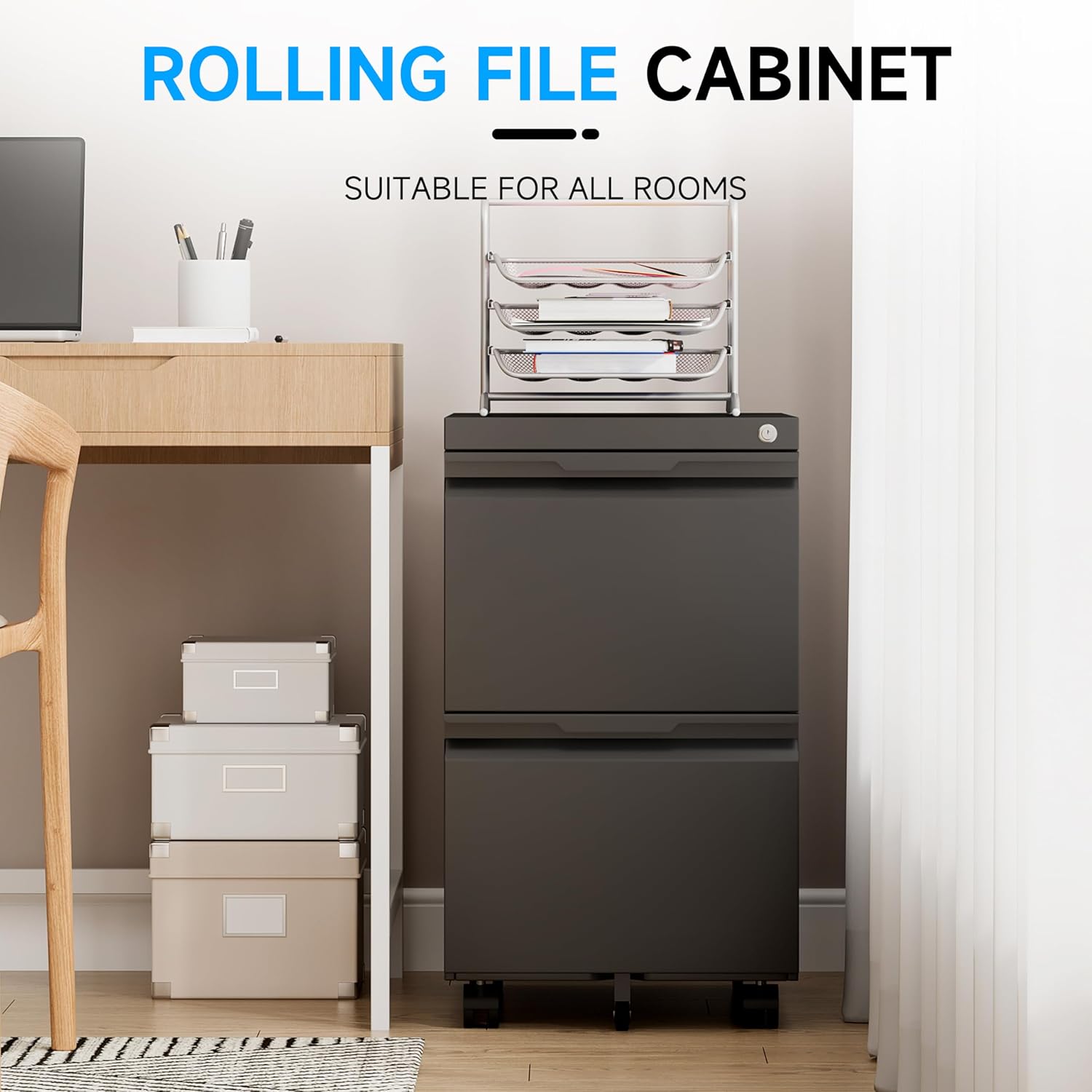 Bestoo 2 Drawer Metal Mobile File Cabinet, File Cabinet on Wheels with Lock for Letter/Legal/A4 File Under Desk, Metal Rolling File Cabinets for Home Office(Black)