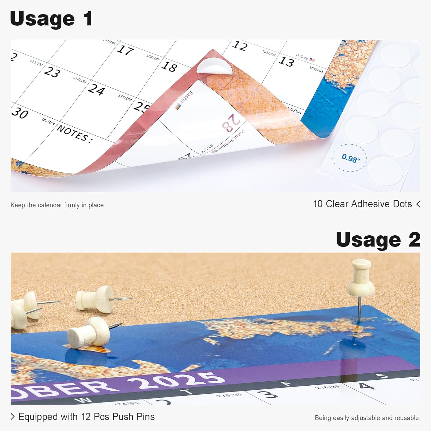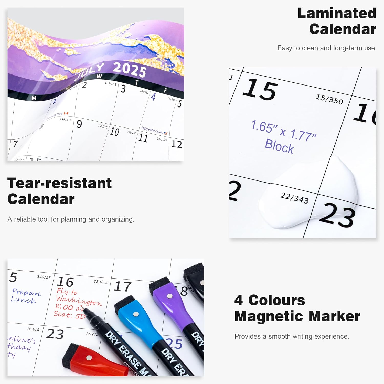 - ⨠Laminated Calendar with Dates: Waterproof wall calendar comes with a mini eraser, four dry-erase markers, 12 push pins, and 10 transparent round stickers. 12 months calendar covers the time range from July 2025 to June 2027, making it perfect for long-term use.