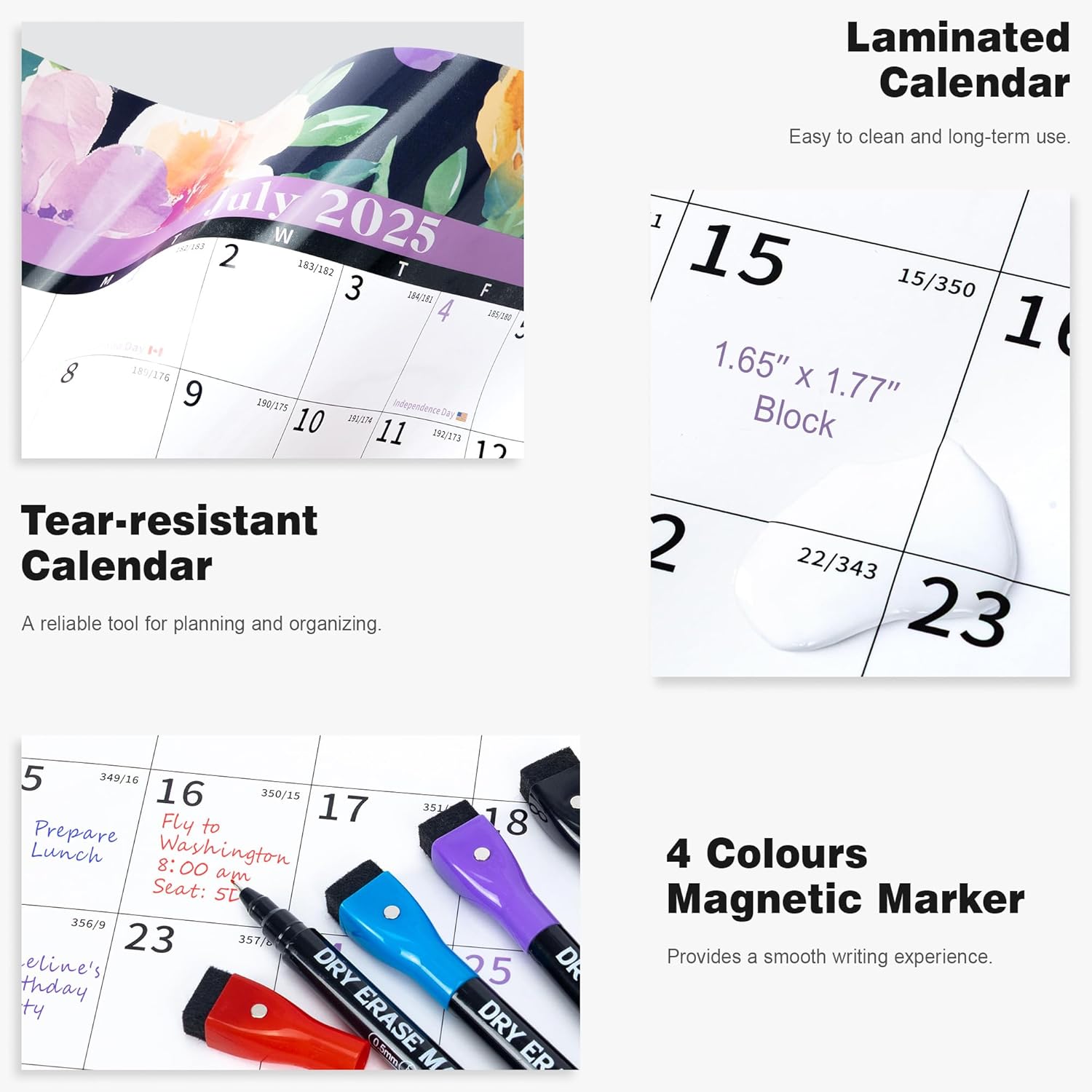 - ⨠Laminated Calendar with Dates: Waterproof wall calendar comes with a mini eraser, four dry-erase markers, 12 push pins, and 10 transparent round stickers. 12 months calendar covers the time range from July 2025 to June 2027, making it perfect for long-term use.