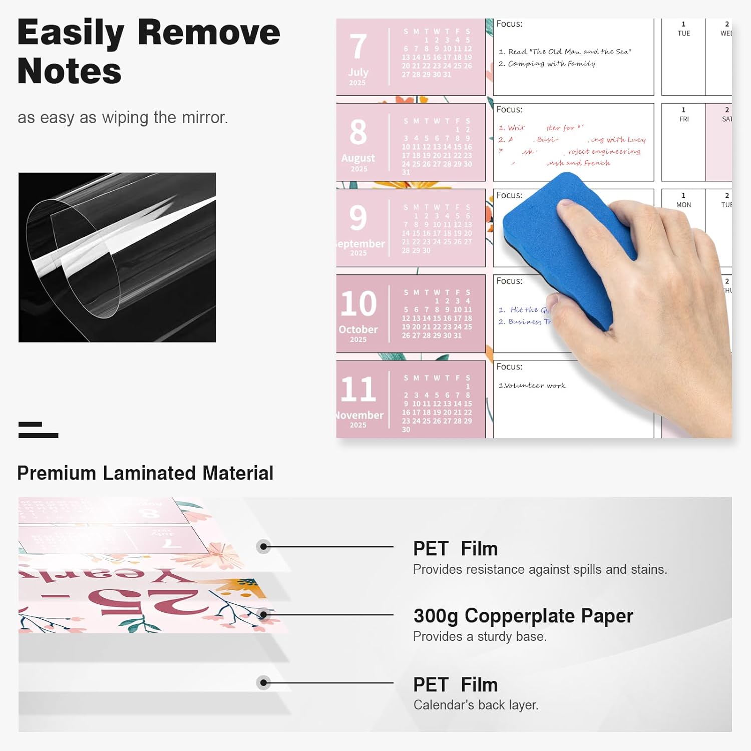 - ⨠Laminated Calendar with Dates: Waterproof wall calendar comes with a mini eraser, four dry-erase markers, 12 push pins, and 10 transparent round stickers. 12 months calendar covers the time range from July 2025 to June 2026, making it perfect for long-term use.