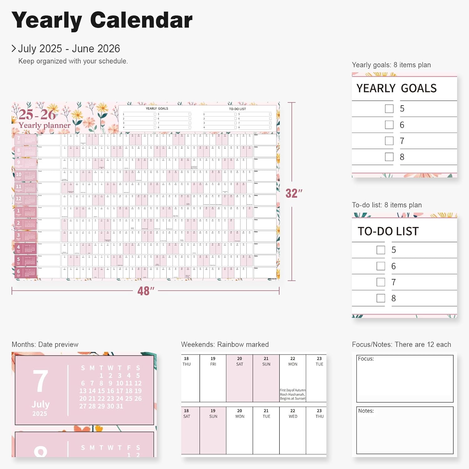 Ospelelf Calendar 2025-2026 Large Dry Erase Wall Calendar 32'' x 48'', 12 Month Laminated Calendar for Classroom, Family, Use July 2025 - June 2026 (Floral)