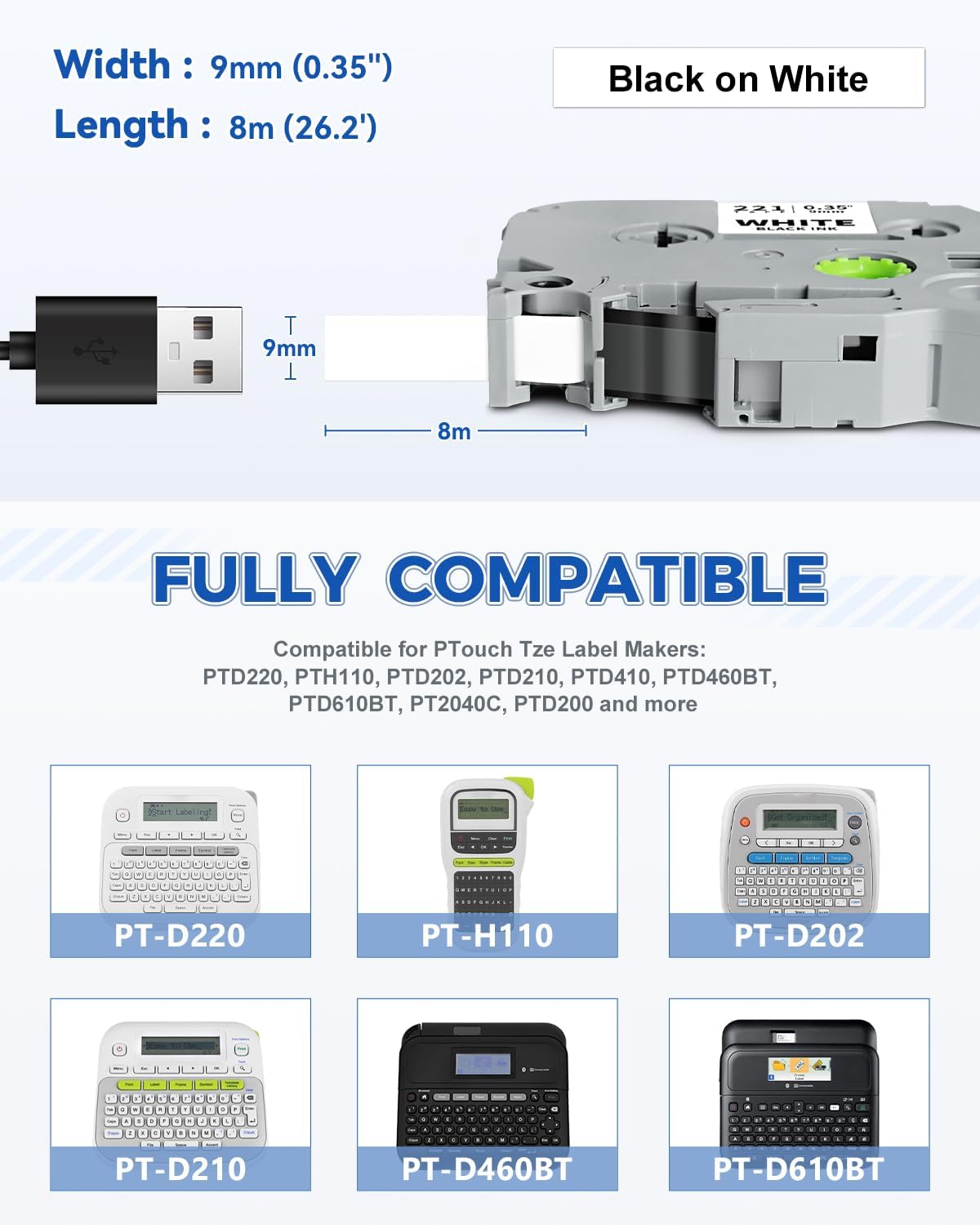 - Packages: 4-Pack 9mm 0.35" white label tape compatible with Brother tze-221 tze221 tz-221 9mm 3/8" black on white label maker tape. Color: Black on white. Size: 3/8 inch (9mm 0.35") x 26.2 feet (8m)