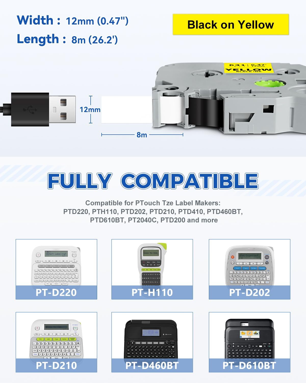 - Packages: 4-Pack 12mm 0.47" yellow label tape compatible with Brother tze-631 12mm 0.47 black on yellow tape. Color: Black on Yellow. Size: 1/2 inch (12mm 0.47") x 26.2 feet (8m)