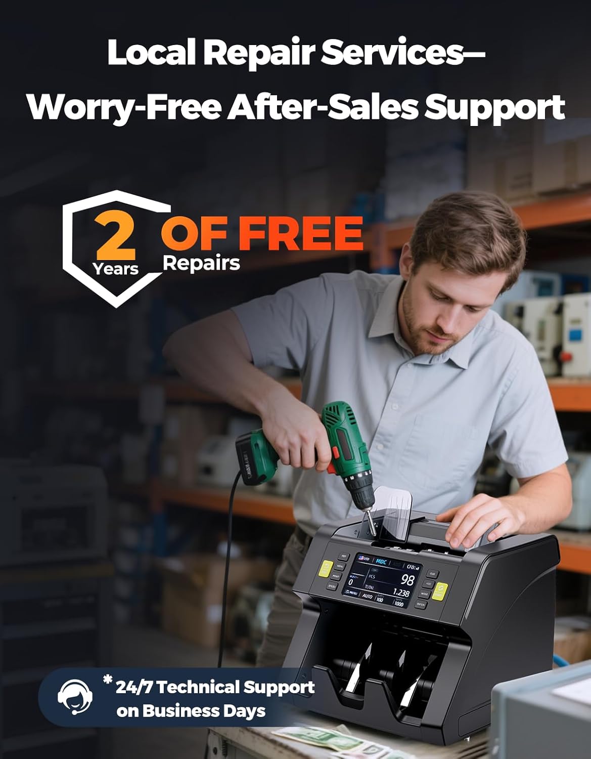 - [Technical Support] We provide- ①Two years of quality protection. If you need repair services, our local centers(within the United States)are available to assist you. Get in touch with us. ②lifetime software upgrade, and 24-hour technical support available on weekdays. ③For your privacy and security, there is no information about the cash counting machine on the outer box.