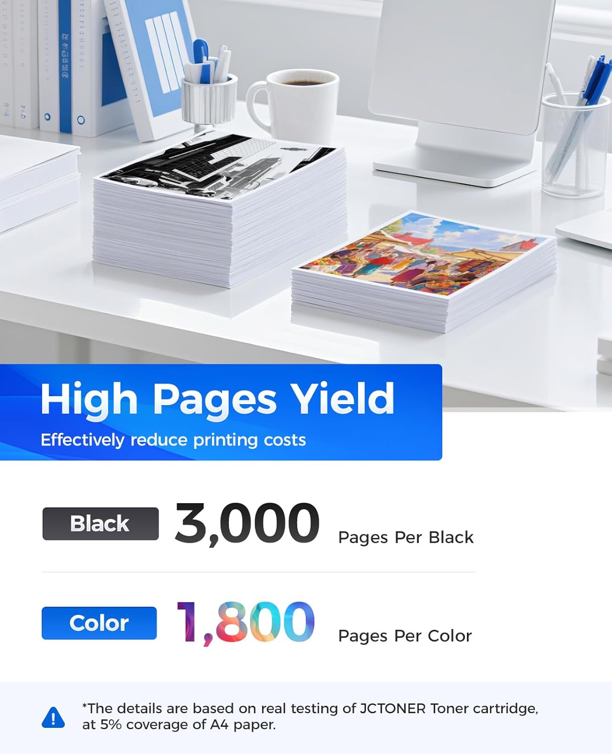 - The latest chip version: The JCTONER toner cartridges are equipped with the latest version of built-in chips, ensuring perfect compatibility between each toner cartridge and the printer. This enables you to print efficiently while maintaining stability and reliability, making installation convenient without the need for manual adjustments. All JCTONER toner cartridges have undergone strict quality testing and have obtained ISO9001 certification. High-quality toner cartridges can meet the demand for high printing volume. The fine toner ensures clear and stain-free printing results and extends the lifespan of the printer. You can purchase with confidence.