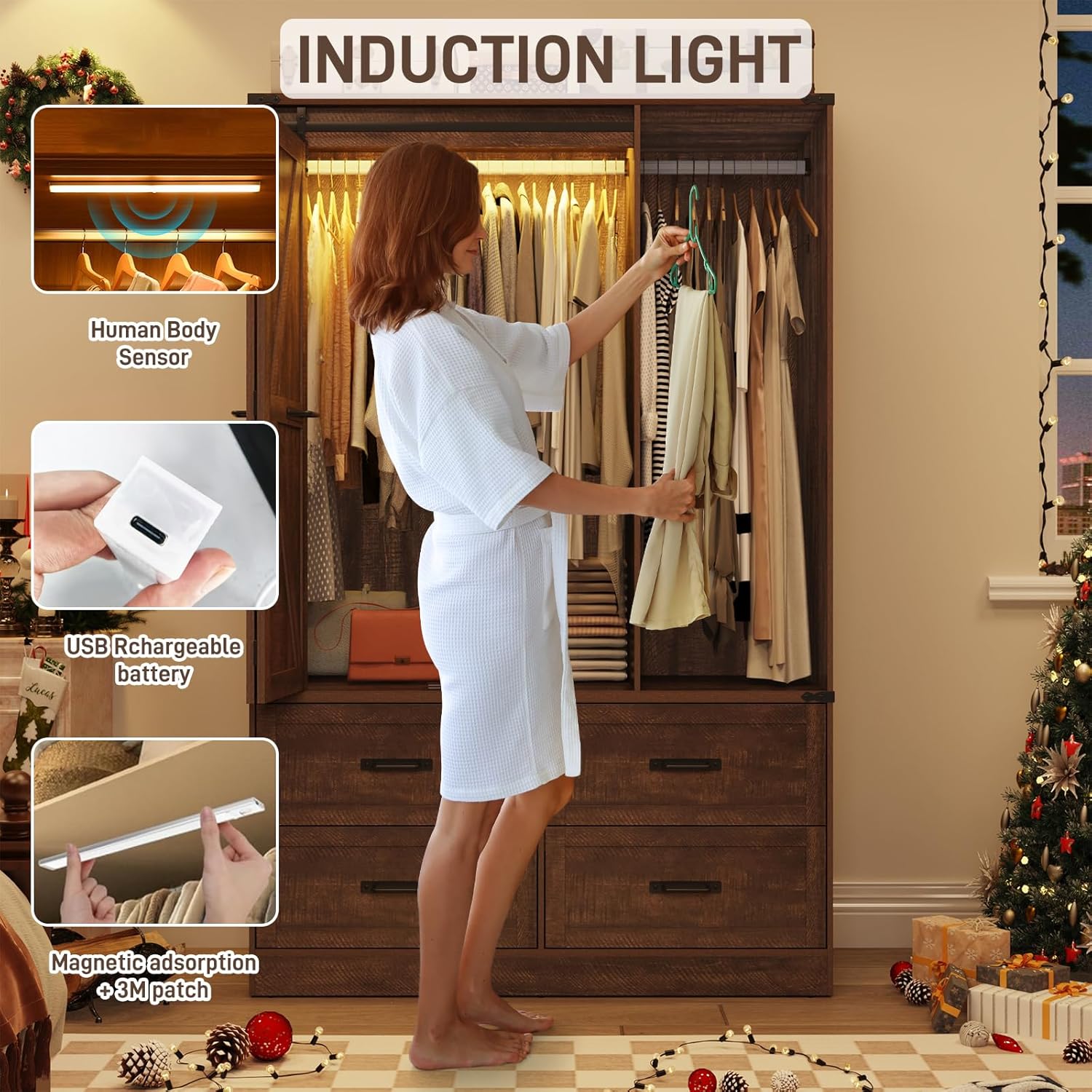 - 3 Door Wardrobe Closet with Motion Sensor Light: Our led wooden wardrobe closet come with induction light which will turn on automatically when you get within 120Β° and 16 feet, allows you to choose your clothes conveniently whether at night or low light environment.The light could be chargeable by usb cable which included in package. Auto/On/Off 3 modes available for different occasions which more bang for your buck than other closet.