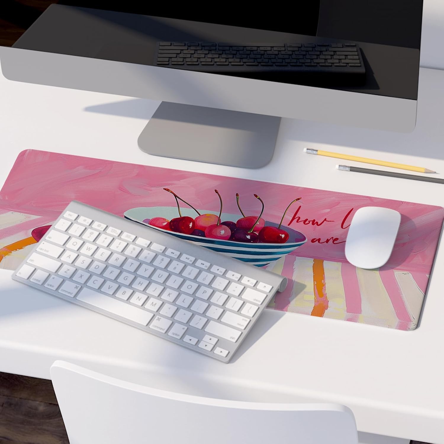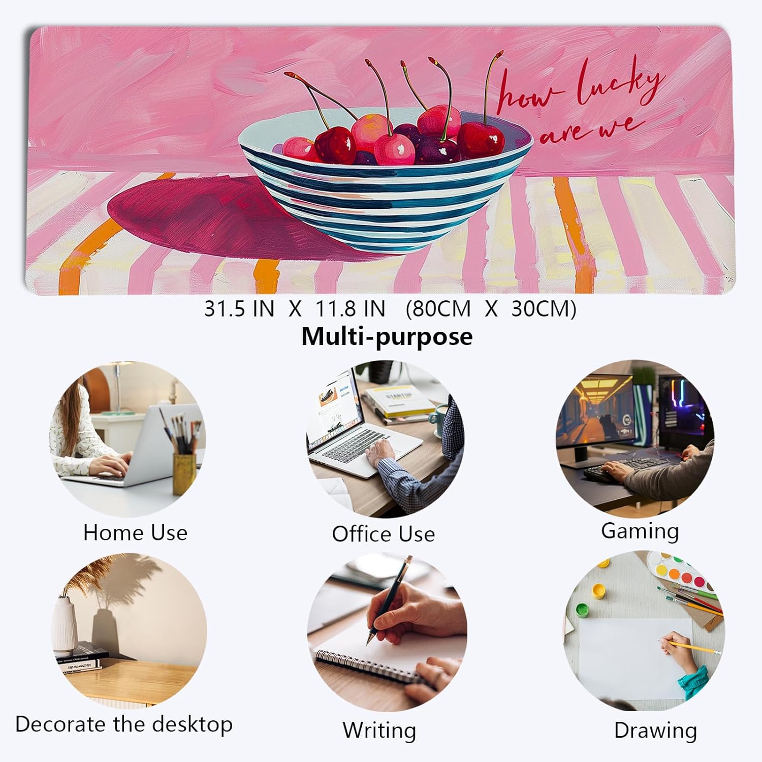 Pink Cherry Mouse Pads,Fun Girly Offices Decor Desk Mat,Pink Preppy Desk Mat,How Luck XL Large Mouse Pad,Fun Office Accessories Decor for Women Home Office Dorm 31.5x11.8Inch