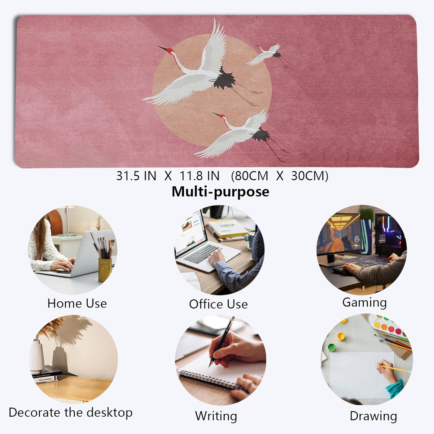 Retro Chinese Style Mouse Pad,Vintage Japanese Style Desk Pad,XL Large China Red Crowned Crane Laptop Desk Mat,Girly Pink Gaming Computer Pads,Girly Desk Mat For Home Office Dorm,31.5x11.8Inch