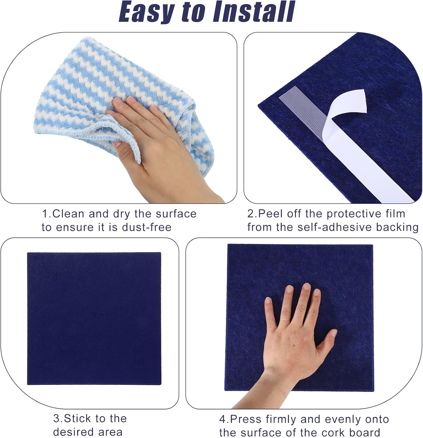 - 【Easy to Install】Each cork board is equipped with 2 pcs self-adhesive strips, which have good adhesion and are not easy to fall off. It is very easy to install without nails and other tools. Please refer to the installation diagram or video.