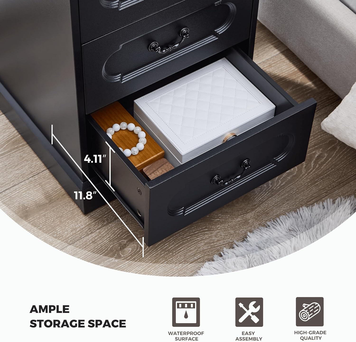 - Wood Dresser-The black dresser for bedroom is crafted from premium-grade engineered wood. This bedroom dresser features a reinforced foundation delivering lasting durability. Drawers are equipped with high-quality metal slide rails, which are easy to pull in and out