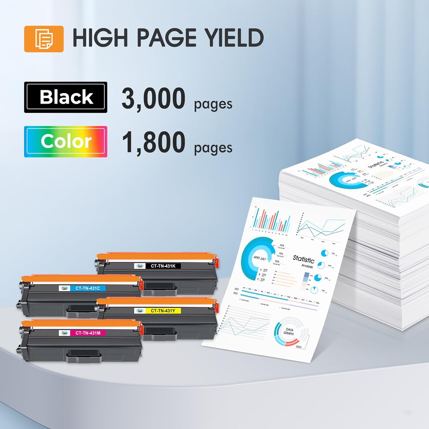 - Page Yield: Up to 3,000 pages per TN431BK toner cartridge (Letter A4, at 5% Coverage), Up to 1,800 pages per TN431C TN431M TN431Y toner cartridge (Letter A4, at 5% Coverage)