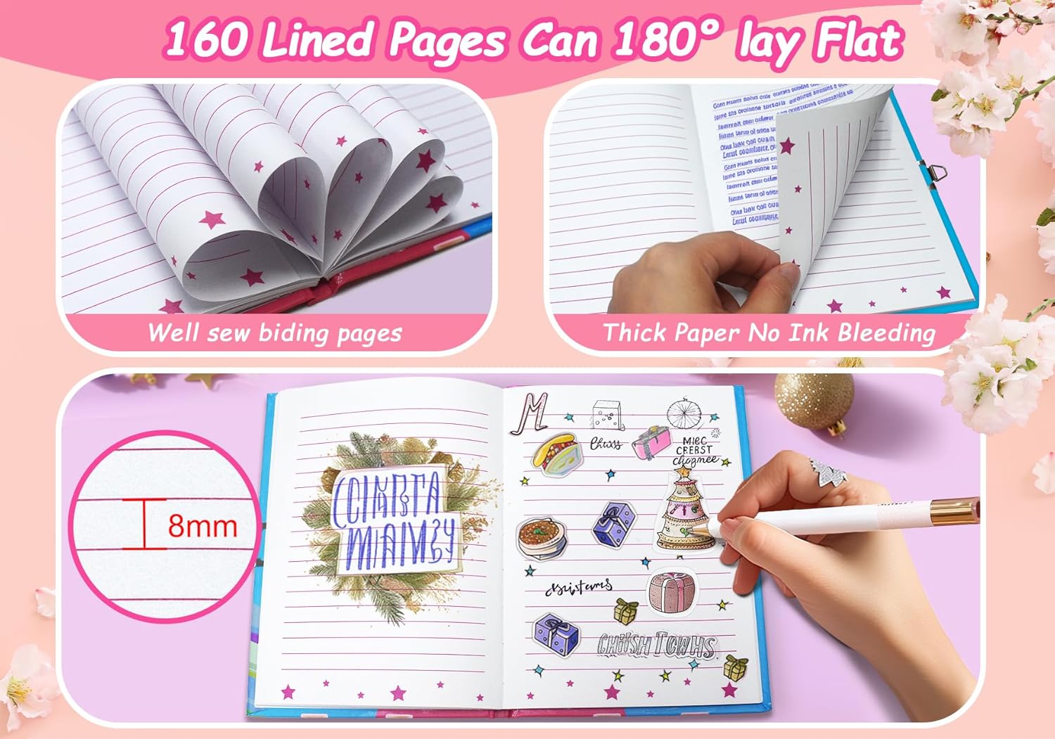 - 【Sturdy Binding Notebook for Kids】- Sturdy hardcover and sewn binding for the pink lockable diary, kids can open this lock journal flat for both pages, comfortable to writing, drawing and coloring