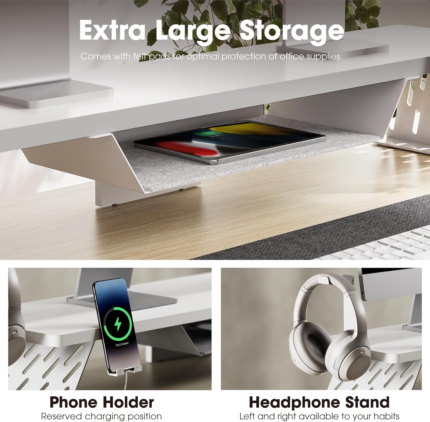 - 【Ergonomic & Adjustable】Monitor shelf raises your monitor or laptop by 5.4 inches to the perfect eye level, reducing neck and shoulder strain. Pre-drilled holes computer stand let you position headphone stand and phone holder left or right according to your habits, balancing efficiency and health.
