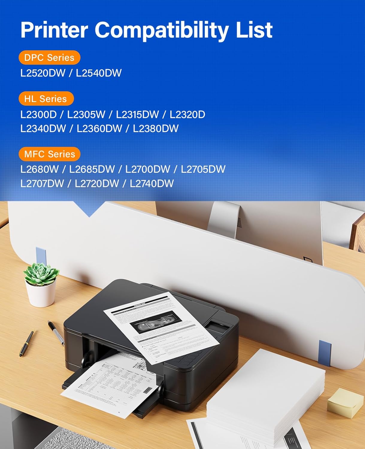 - Compatible Printer: Compatible with Brother DCP-L2520DW, DCP-L2540DW, HL-L2300D, HL-L2305W, HL-L2315DW, HL-L2320D, HL-L2340DW, HL-L2360DW, HL-L2380DW, MFC-L2680W, MFC-L2685DW,MFC-L2700DW, MFC-L2705DW, MFC-L2707DW, MFC-L2720DW, MFC-L2740DW(Please check that your printer model matches the printer model of this toner cartridge before placing an order).