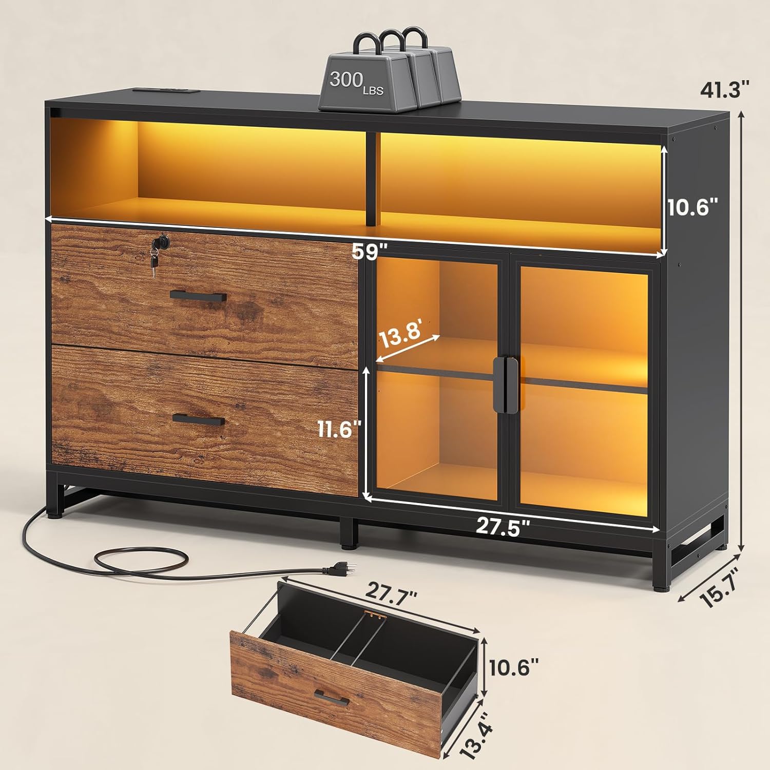 SEDETA 59" File Cabinet, 2 Drawers Filing Cabinets for Home Office fit Legal/Letter/A4 File, File Cabinet with Lock & Power Outlets, Printer Stand with Storage & LED Lights, Rustic Brown