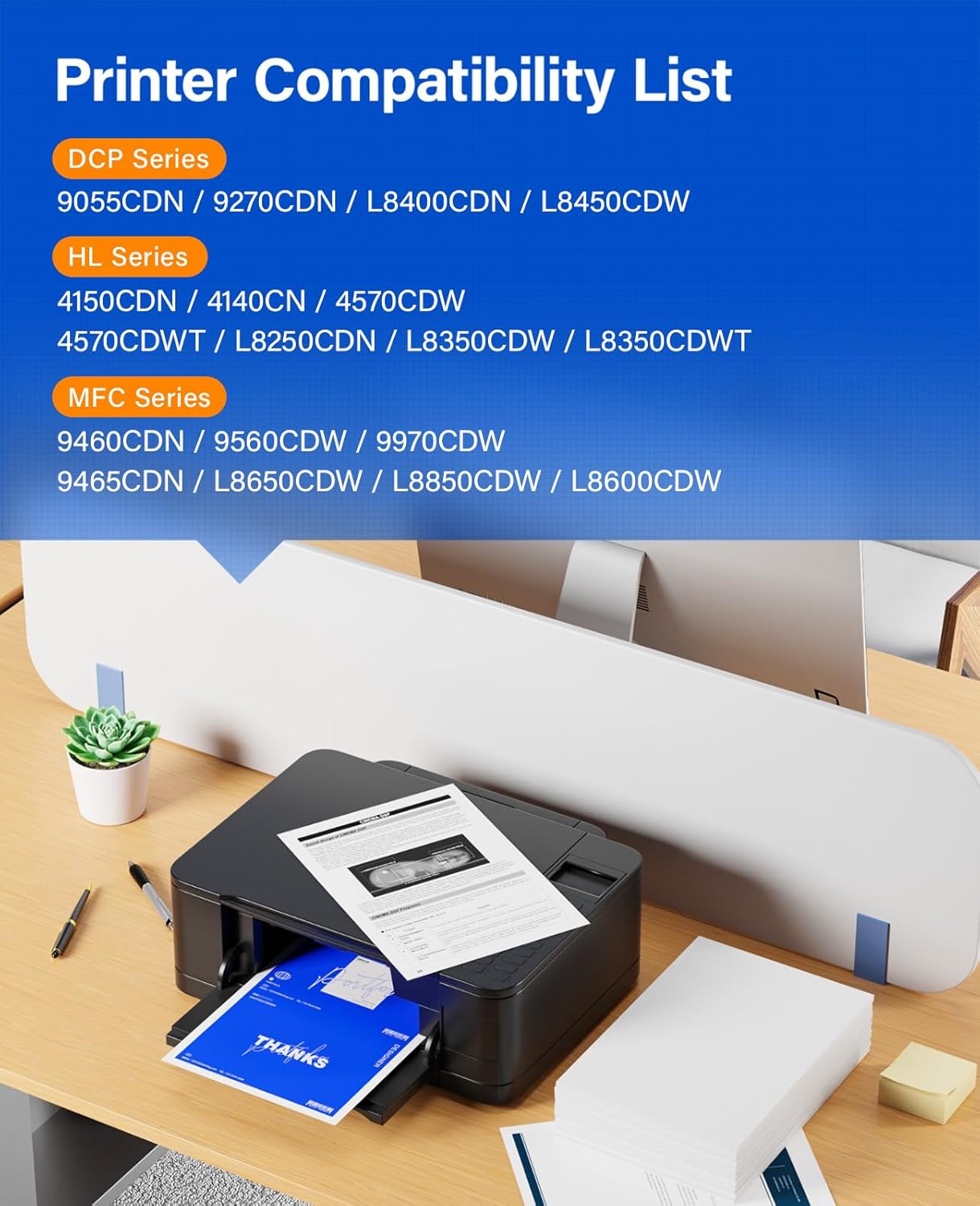 - Compatible Printer: Compatible with Brother DCP-9055CDN, DCP-9270CDN,DCP-L8400CDN, DCP-L8450CDW, HL-4150CDN, HL-4140CN, HL-4570CDW, HL-4570CDWT, HL-L8250CDN, HL-L8350CDW, HL-L8350CDWT, MFC-9460CDN, MFC-9560CDW, MFC-9970CDW, MFC-9465CDN, MFC-L8650CDW, MFC-L8850CDW, MFC-L8600CDW (Please check that your printer model matches the printer model of this toner cartridge before placing an order).
