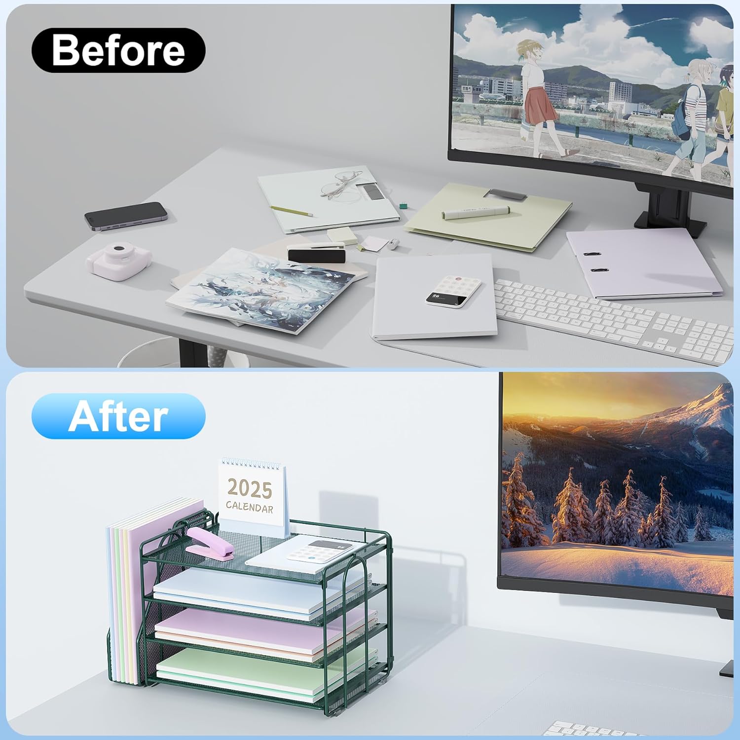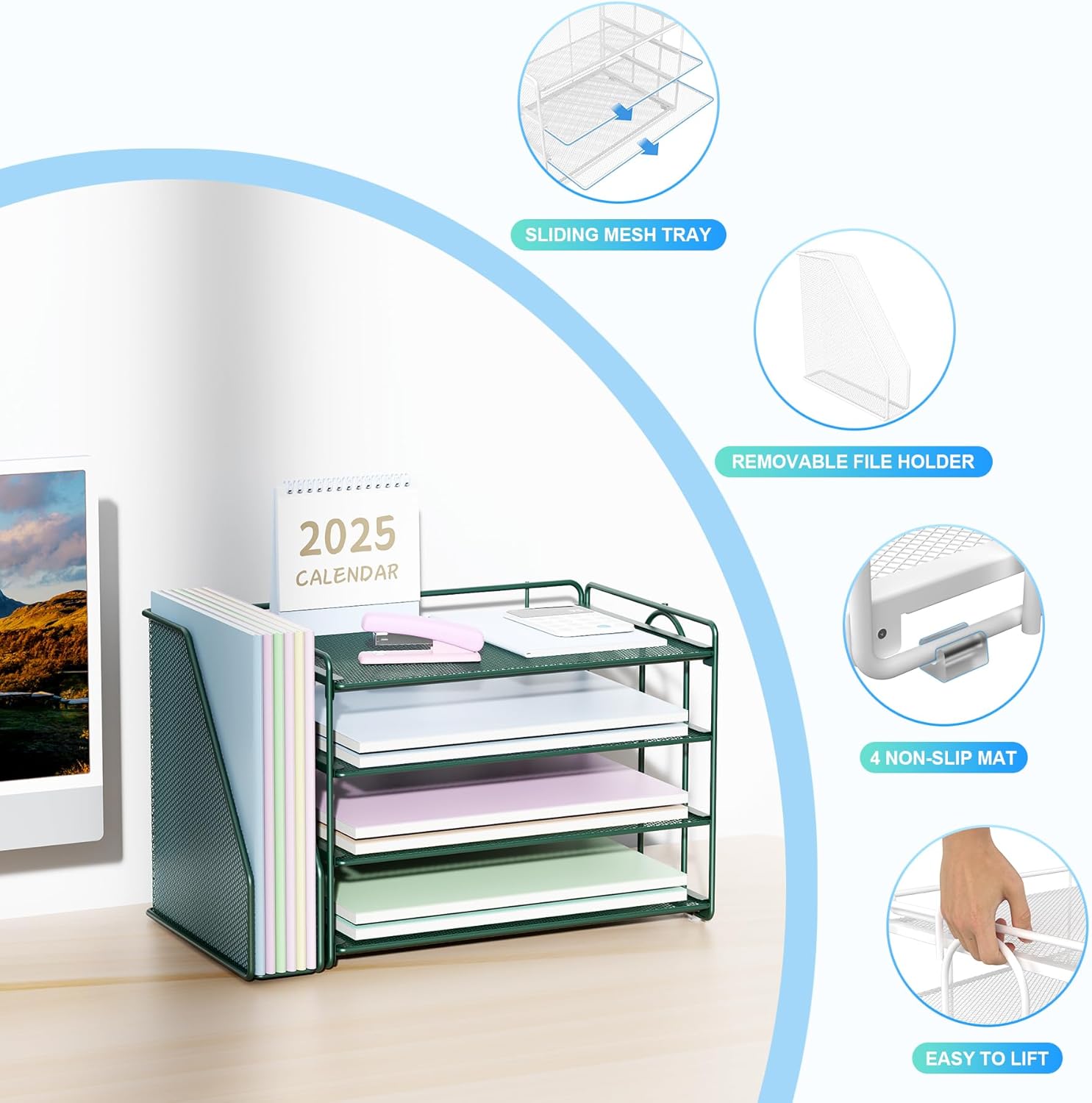 - ā¶ Save desktop space: The office desk organizer provides you with 4 paper trays and a vertical file organizer, providing ample space for your desktop and helping to keep your desktop organized and free of clutter.