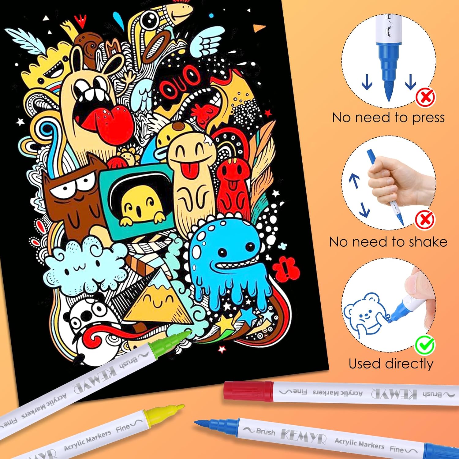 - Dual Tip Acrylic Paint Pens----Each KEMYR pen is equipped with a 1 mm fine tip for lines and details work, and a 1 - 5 mm brush tip for filling large areas and coloring. By changing the brush pressure, you can create different strokes, saving the trouble of changing tips.