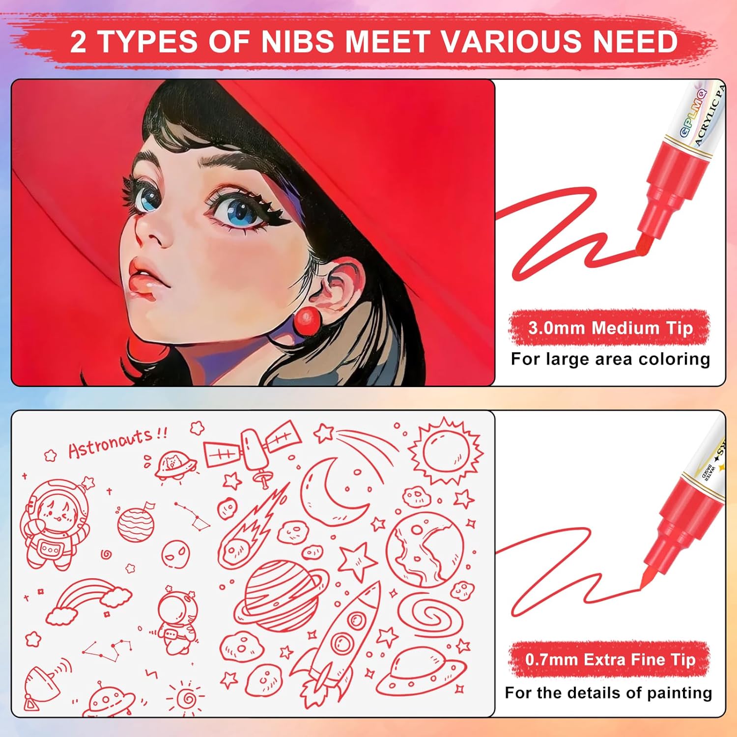 - Dual-Tip Design for Versatility: Each paint pen features a 0.7mm fine tip for detailed lines and a 3mm medium tip for filling larger areas, making it perfect for outlining, lettering, and adding intricate details to your DIY projects