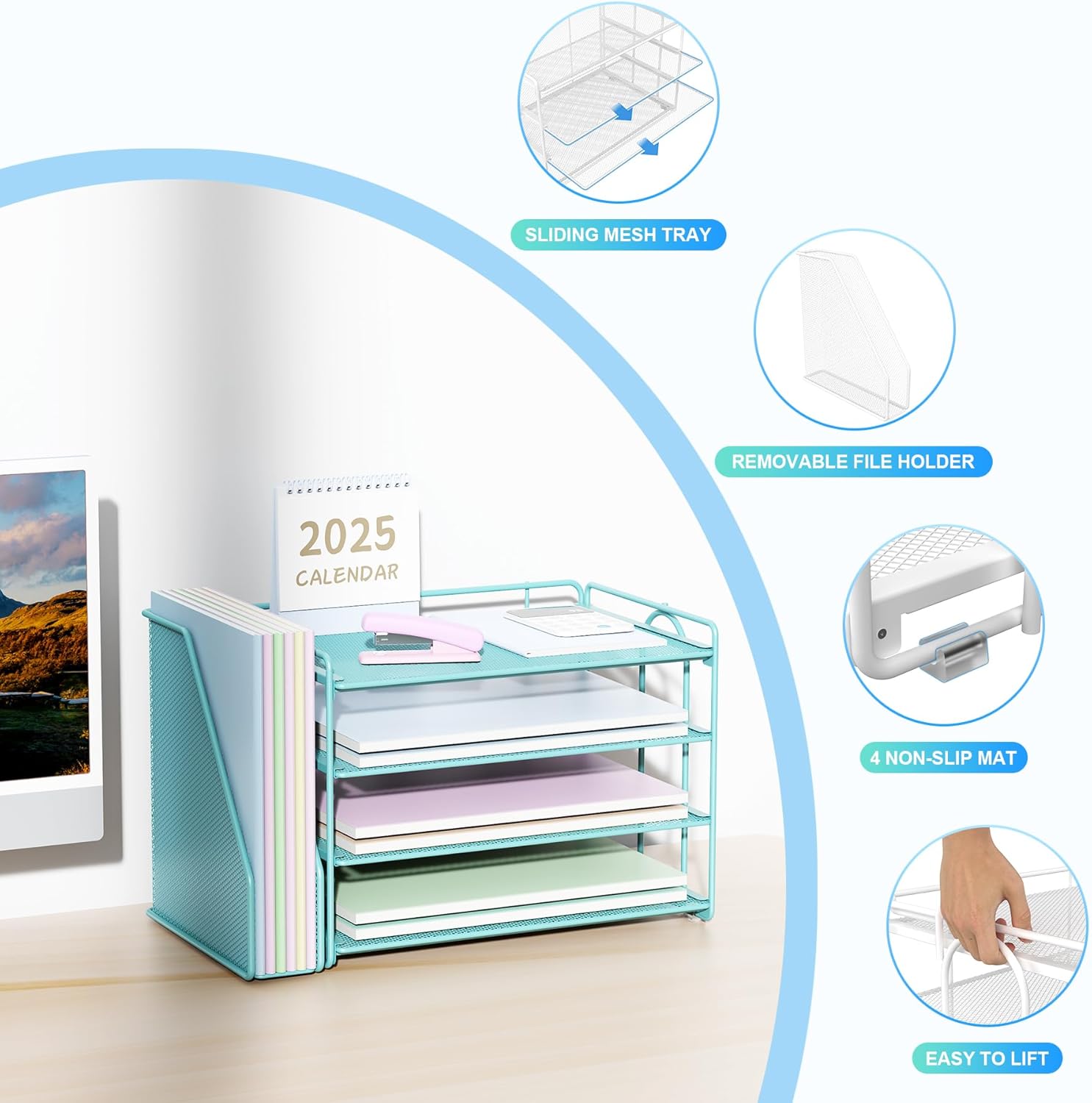 - ā¶ Save desktop space: The office desk organizer provides you with 4 paper trays and a vertical file organizer, providing ample space for your desktop and helping to keep your desktop organized and free of clutter.