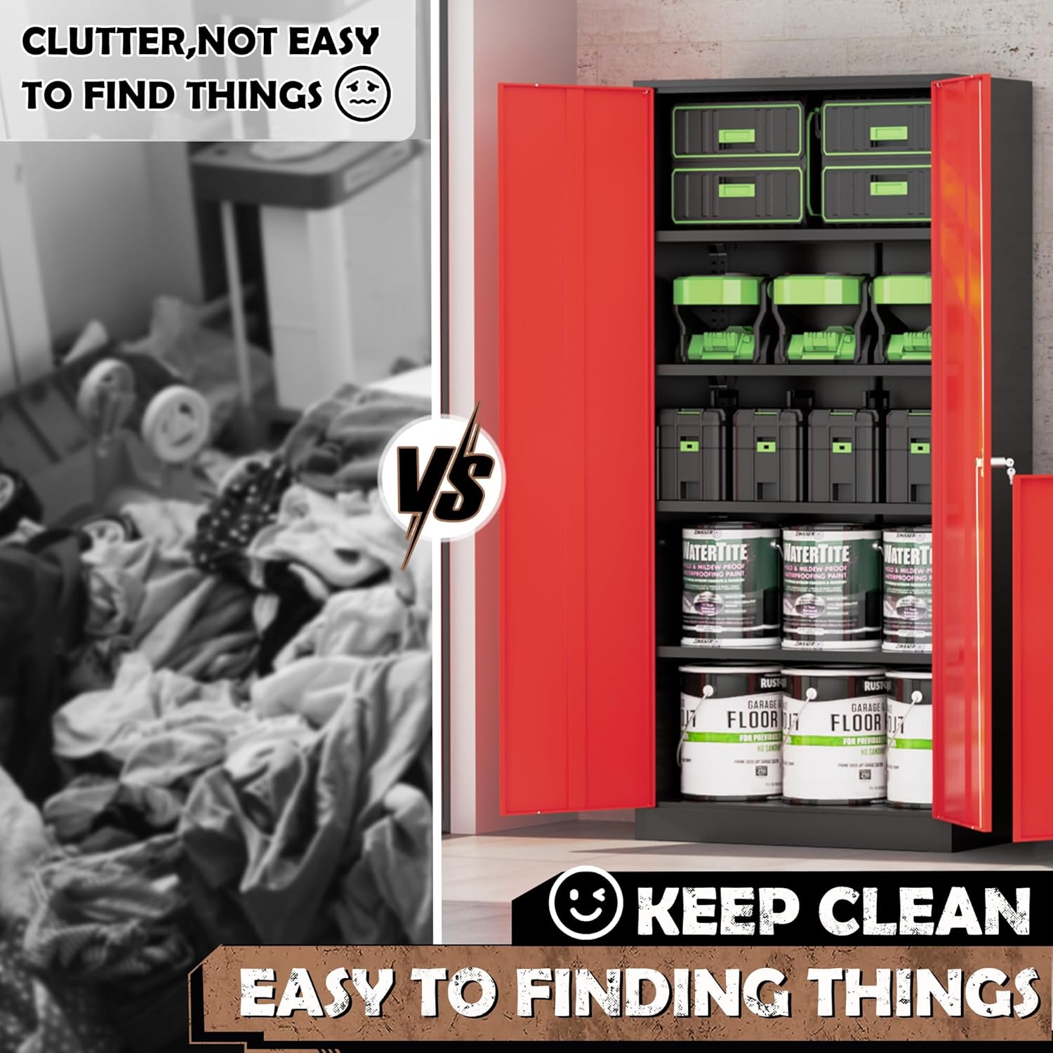 - ✅【4 Adjustable Shelves】Metal cabinet is made of high quality cold rolled steel, prevent from scratching, denting, chipping; adopting powder coat, anti-rust and colorfast. There are 4 adjustable shelves and 5 tier storage space meet your needs to store different size items, each shelf of locking storage cabinets can load 180lbs