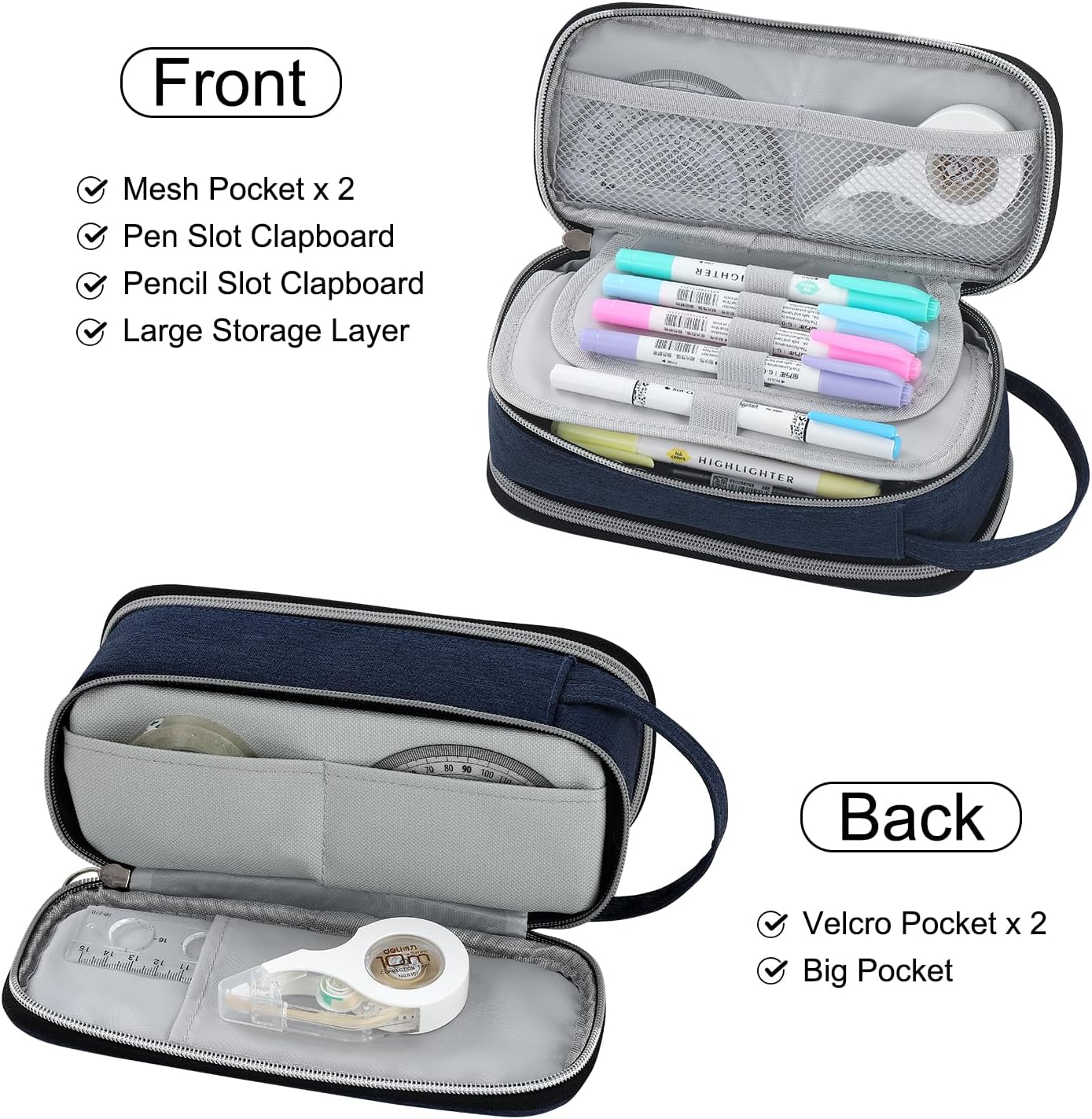 - Multi Pockets Design - Use this multifunctional pencil pouch to keep your stationery organized, it has 2 mesh pockets, 2 pencil slot clapboards, a large-capacity storage layer, and 2 velcro pockets, a big pocket.