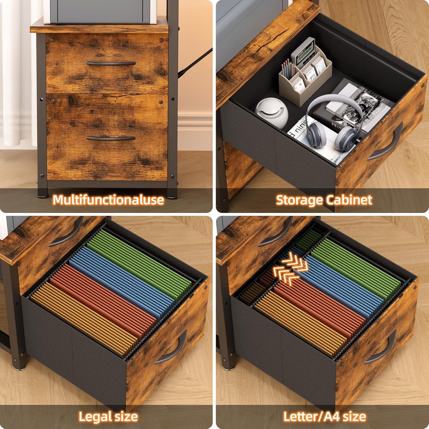 - 【Large Workspace and Powerful Storage】 The 69.3 inch (long) x 18.9 inch (deep) desktop is spacious enough to accommodate a monitor, keyboard, and other items without sacrificing the tidiness of your workspace and desktop. It comes with fabric document drawers, fabric drawers and a printing cabinet with a large storage capacity. The document drawer can hold documents of different sizes, such as letter/A4/legal.
