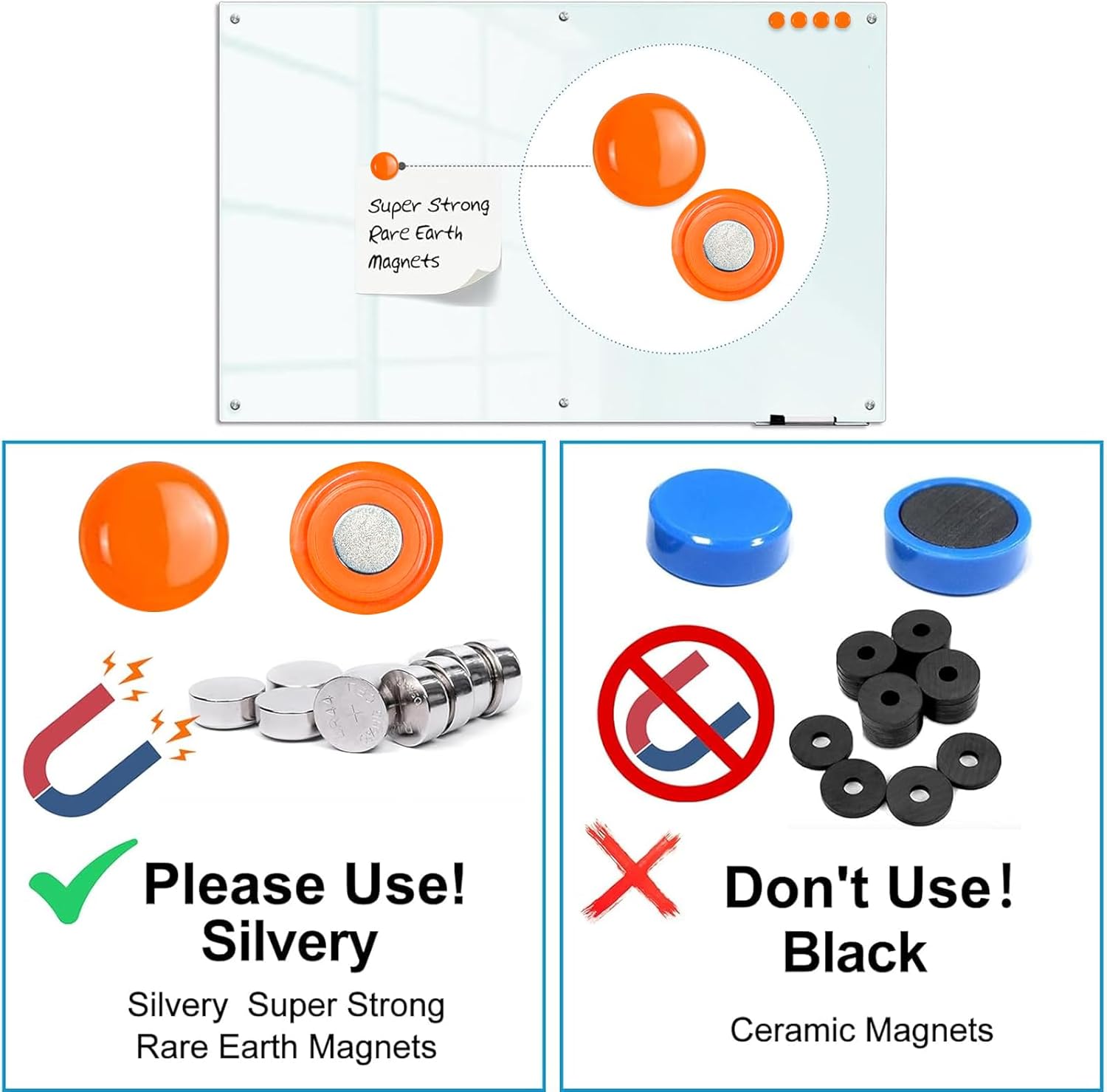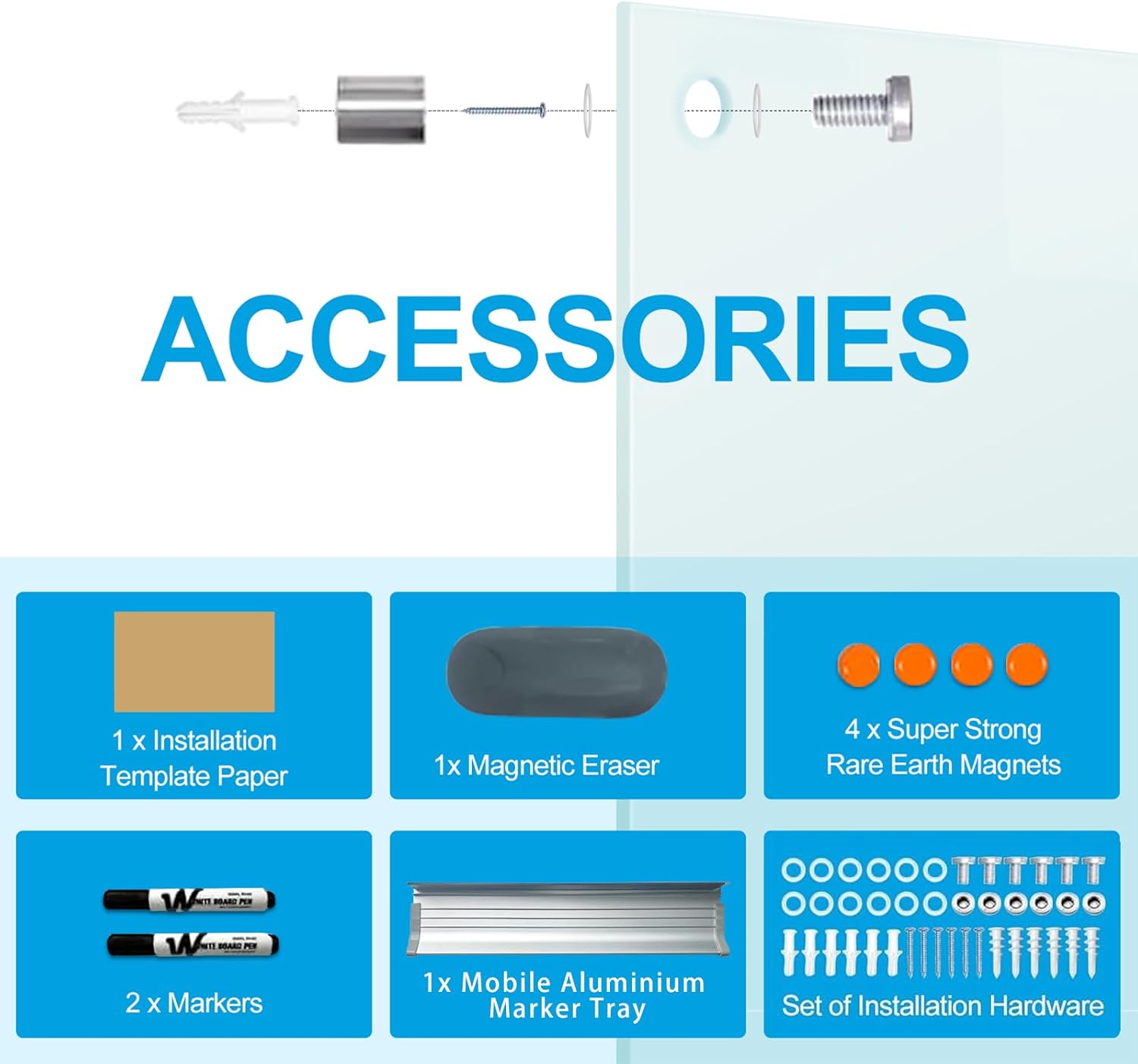 - COMPREHENSIVE ACCESSORIES SET: Comes with one 60" x 36" frameless tempered glass whiteboard, two markers, four magnets, one eraser and one marker tray for mounting. Pay special attention to the magnetism will not be strong due to the thickness of the glass, standard magnets do not work. Please use silvery super strong rare earth magnets. Don't use normal black magnet and fridge magnet.