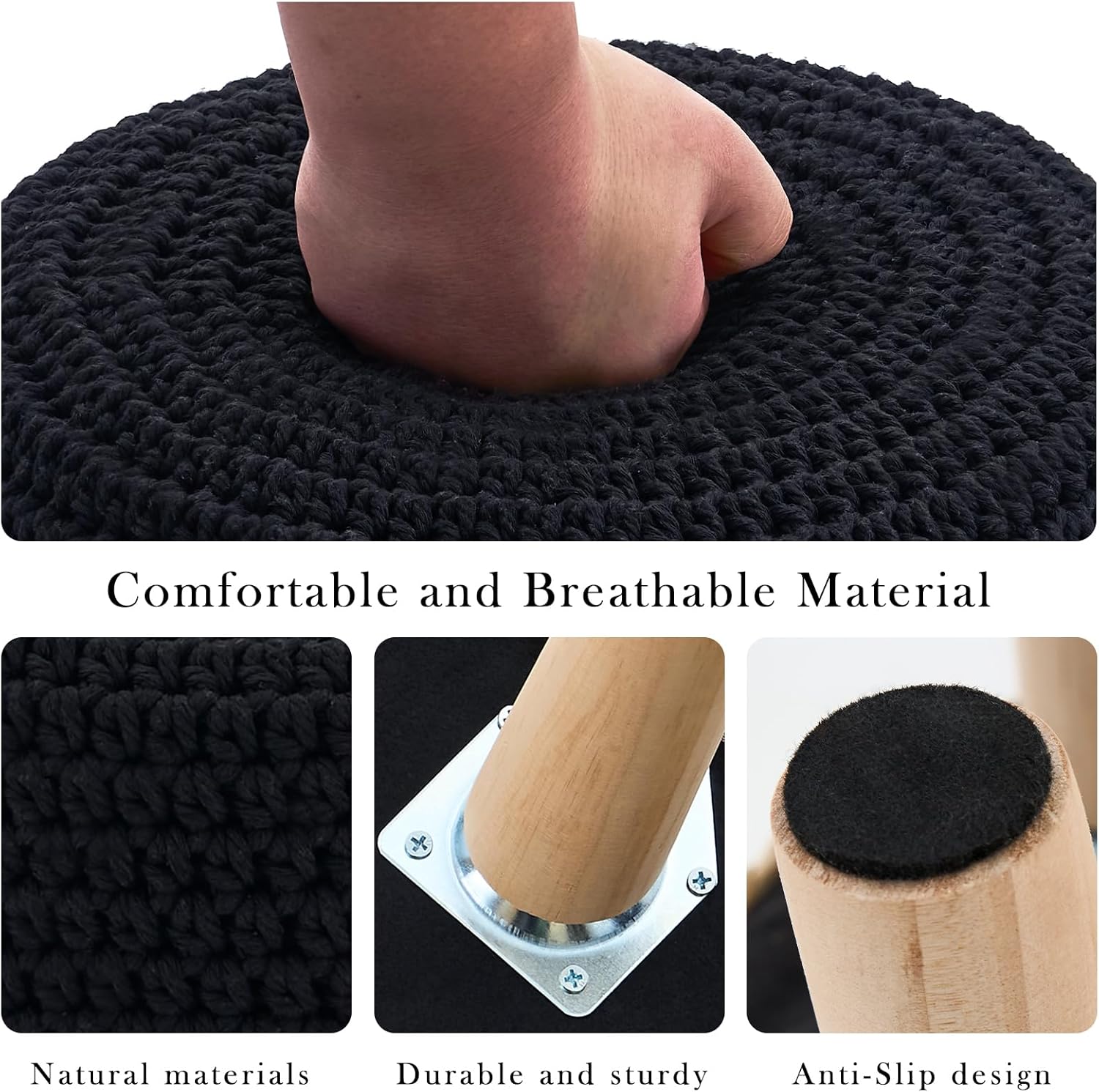 Boho Ottoman Foot Stool Cotton Knitted Round Pouf Ottoman Foot Rest Stool with Non-Skid Wooden Legs Step Stool Padded Seat for Living Room Black