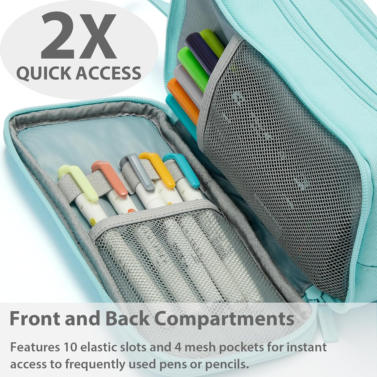 - Our pouches are 3 compartment design. The center pocket is wide opening, making it effortless to instantly store and organize your items. The side pocket is designed with 1 mesh pocket and 4 slots. They have a netbag on the bottom to prevent pens and pencils from falling out.