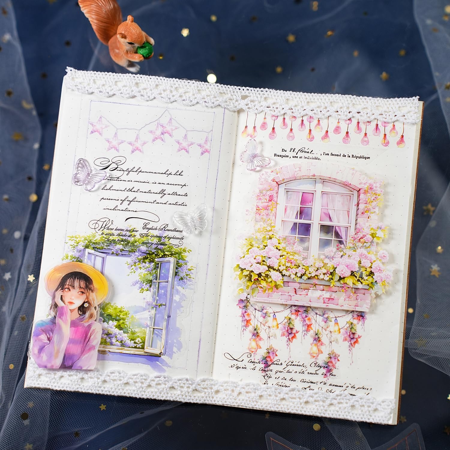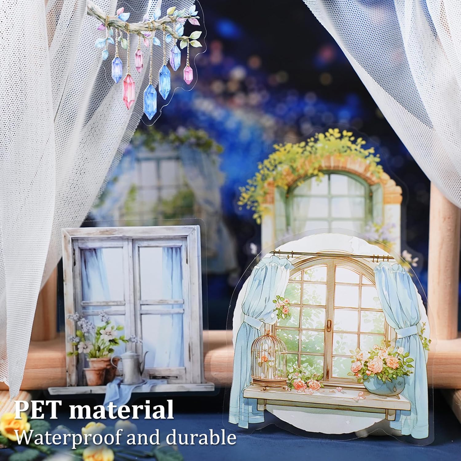 - Romantic Window Scenes: Includes 96 PET stickers featuring 6 enchanting sets of floral-decorated windows and whimsical string lights, with 16 dreamy illustrations per set for scrapbook, journal, and endless creative possibilities