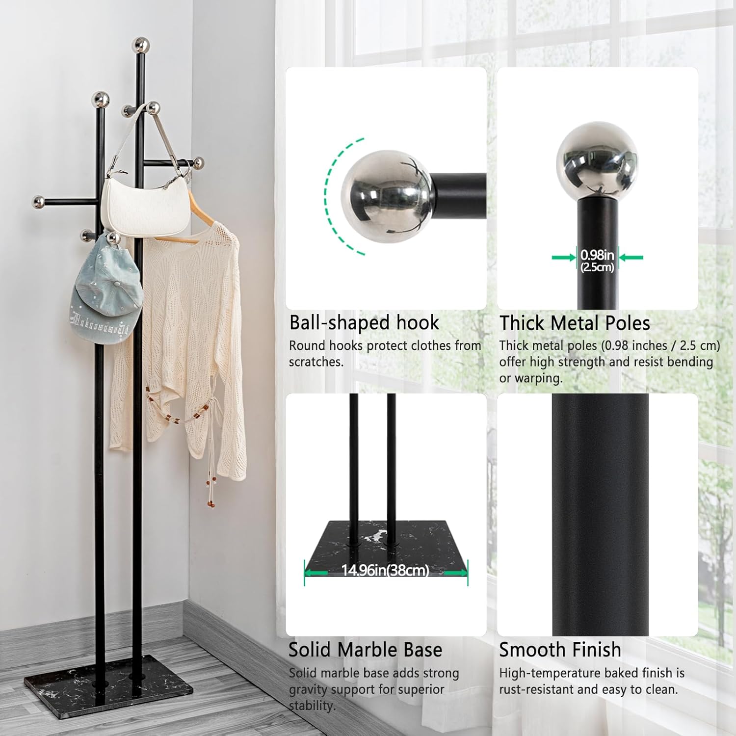 - Metal Rods & Marble Base: Constructed from high-quality metal, this coat tree offers reliable support for heavy items, ensuring stability without bending or tipping. It also features a sturdy marble base, 1.4 cm thick and weighing 4 kg, providing exceptional stability and solid support for the entire rack