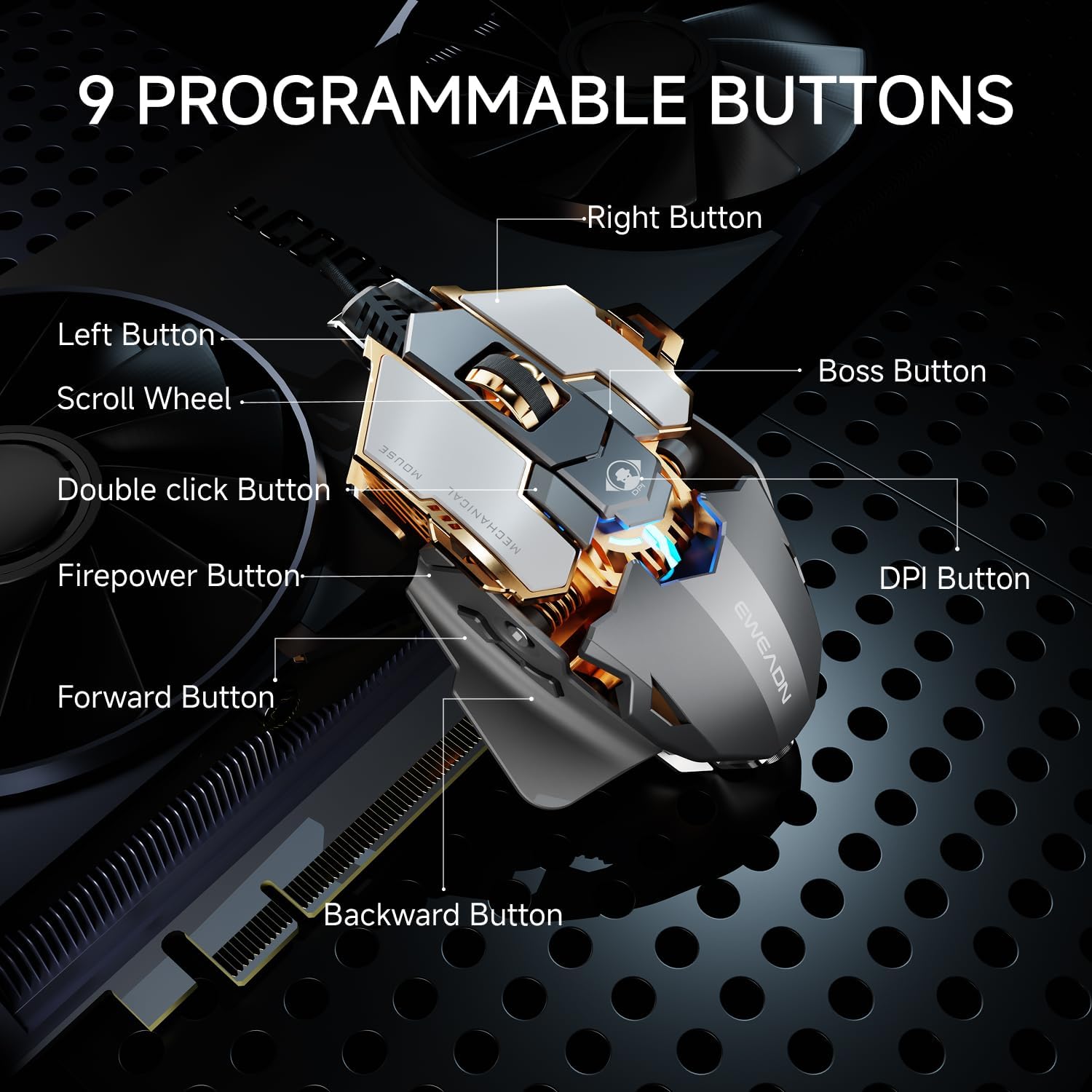 EWEADN G5 Wired Gaming Mouse, Ergonomic RGB Computer Mouse, 12800 Adjustable DPI, 9 Programmable Macro Buttons with Rapid Fire Key Compatible for PC/Laptop/Windows-Grey