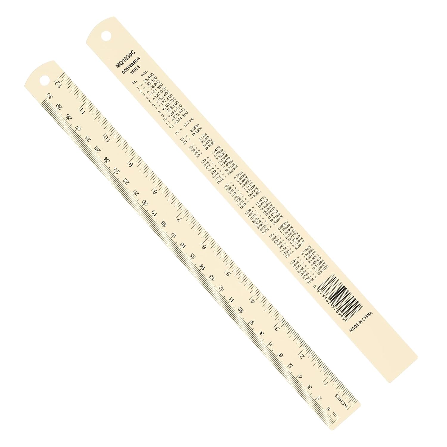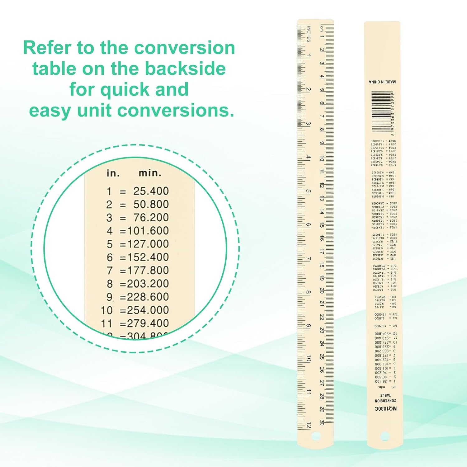 - Instruction: Use the ruler for precise measurements and calculations in both inches and centimeters. Refer to the conversion table on the backside for quick and easy unit conversion. Hang the ruler using the provided hole for convenient storage and accessibility.