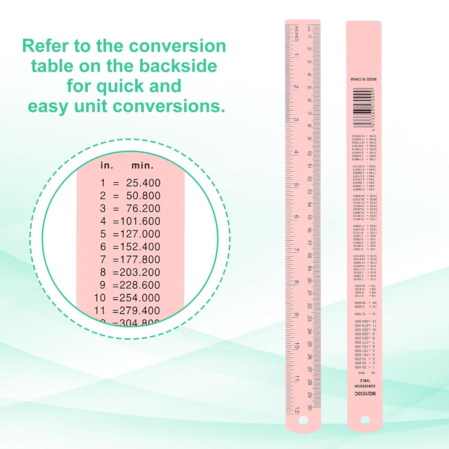 - Instruction: Use the ruler for precise measurements and calculations in both inches and centimeters. Refer to the conversion table on the backside for quick and easy unit conversion. Hang the ruler using the provided hole for convenient storage and accessibility.