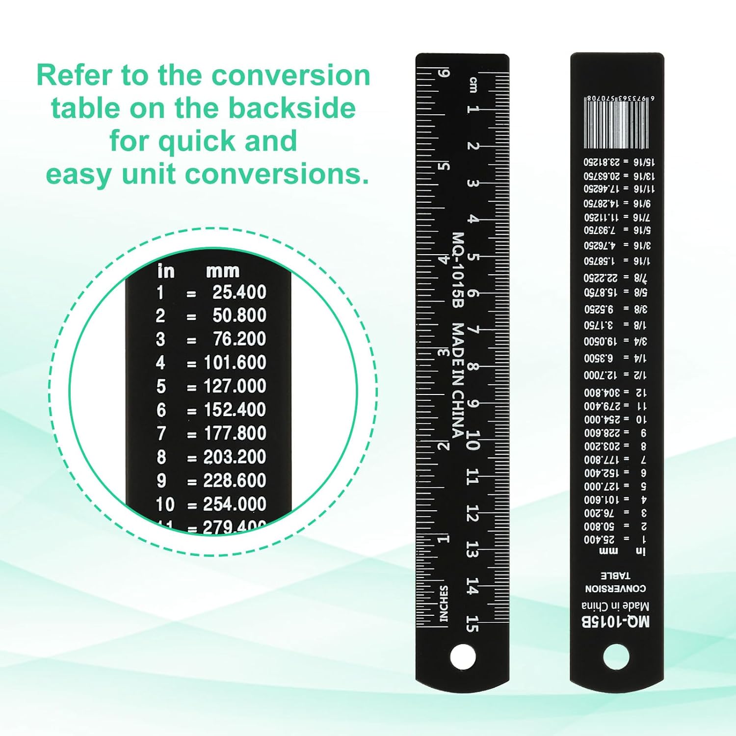 - Instruction: Use the ruler for precise measurements and calculations in both inches and centimeters. Refer to the conversion table on the backside for quick and easy unit conversion. Hang the ruler using the provided hole for convenient storage and accessibility.