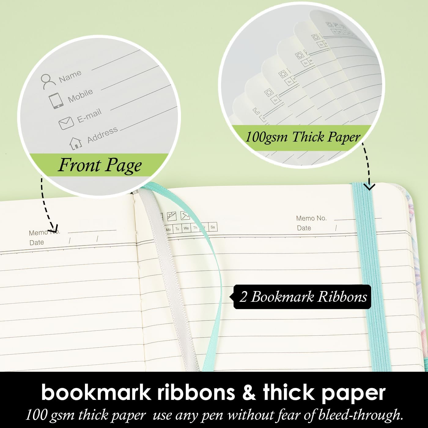 - The small notebook is made of 100gsm ivory thick paper, the paper is smooth, the writing is smooth, and the ink will not bleed. The pocket notebook comes with elastic pen holder loop, elastic closure, and 2 colorful ribbon bookmarks.