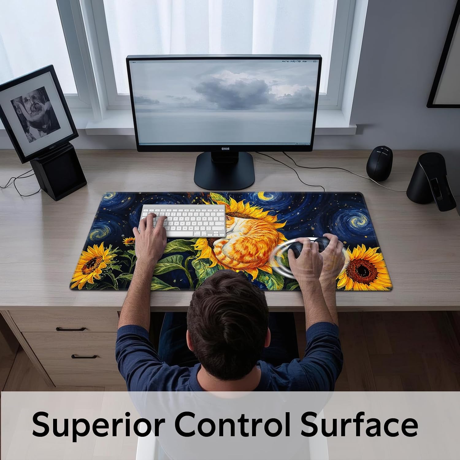 - Large Size: Sunflower Cat mouse pad measures 35.5 x 15.7 inches, providing ample space for your mouse, gaming keyboard, and other desk items while protecting your desk from scratches and stains.